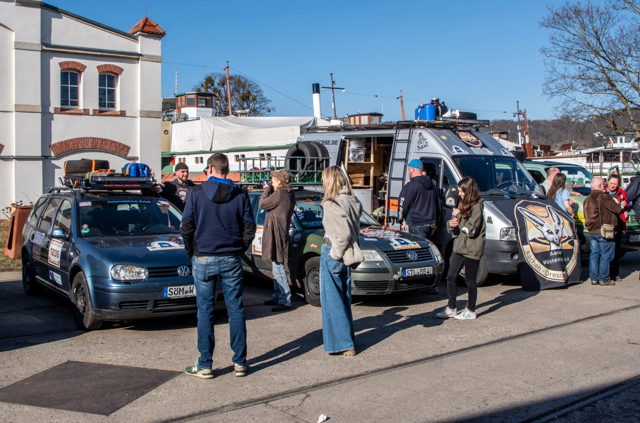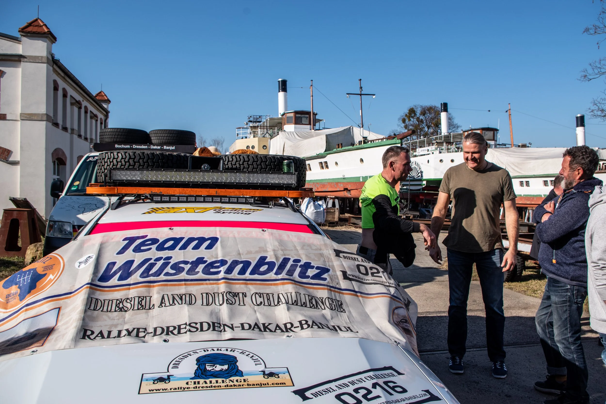 Am Vorabend des großen Starts haben sich Fahrerinnen, Fahrer, Freunde und Unterstützer auf dem Gelände der Laubegaster Werft in Dresden versammelt.