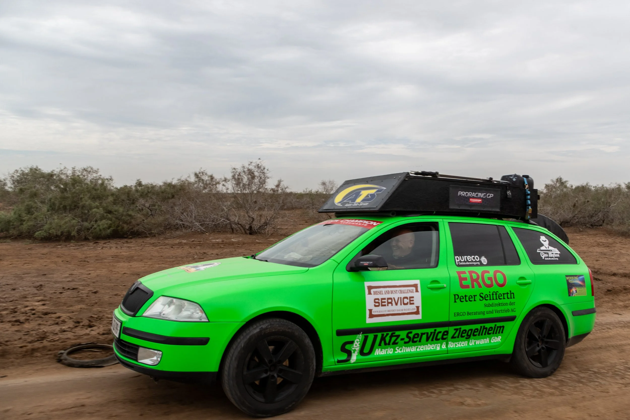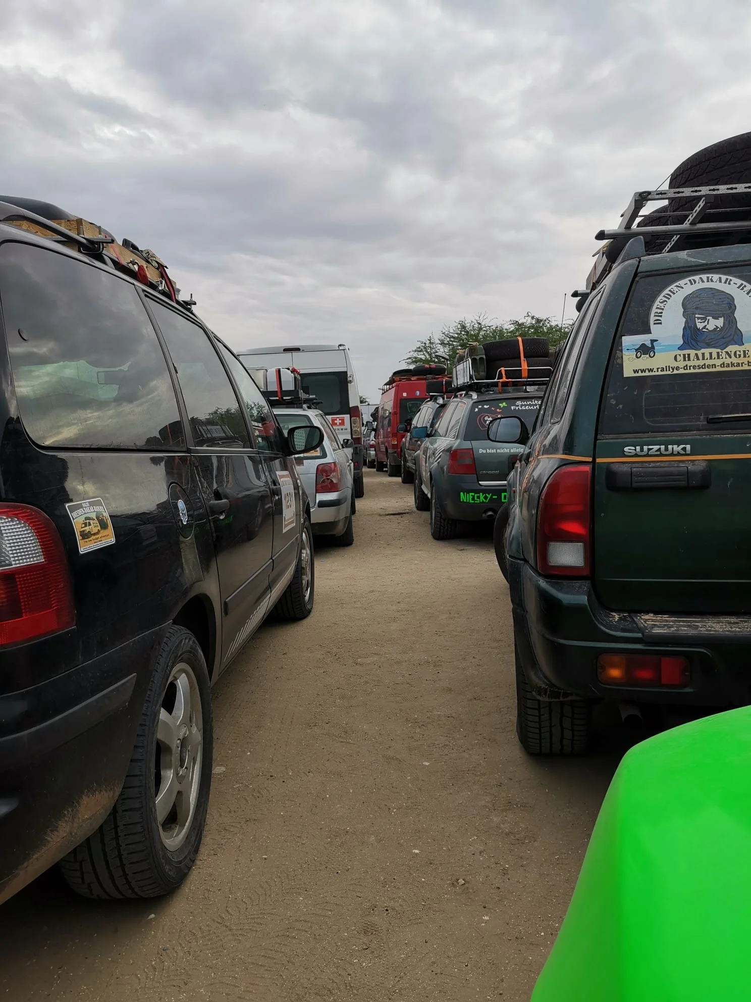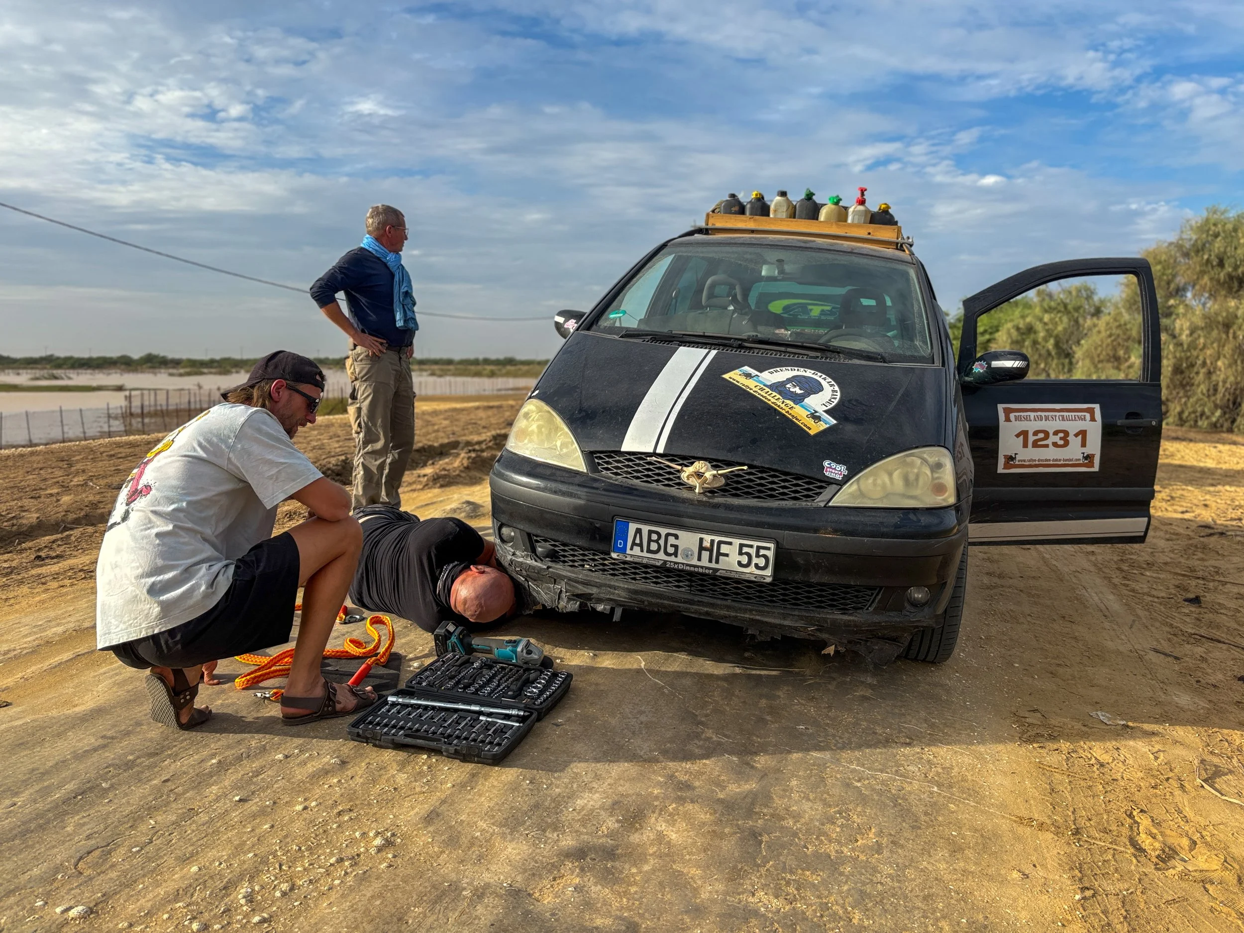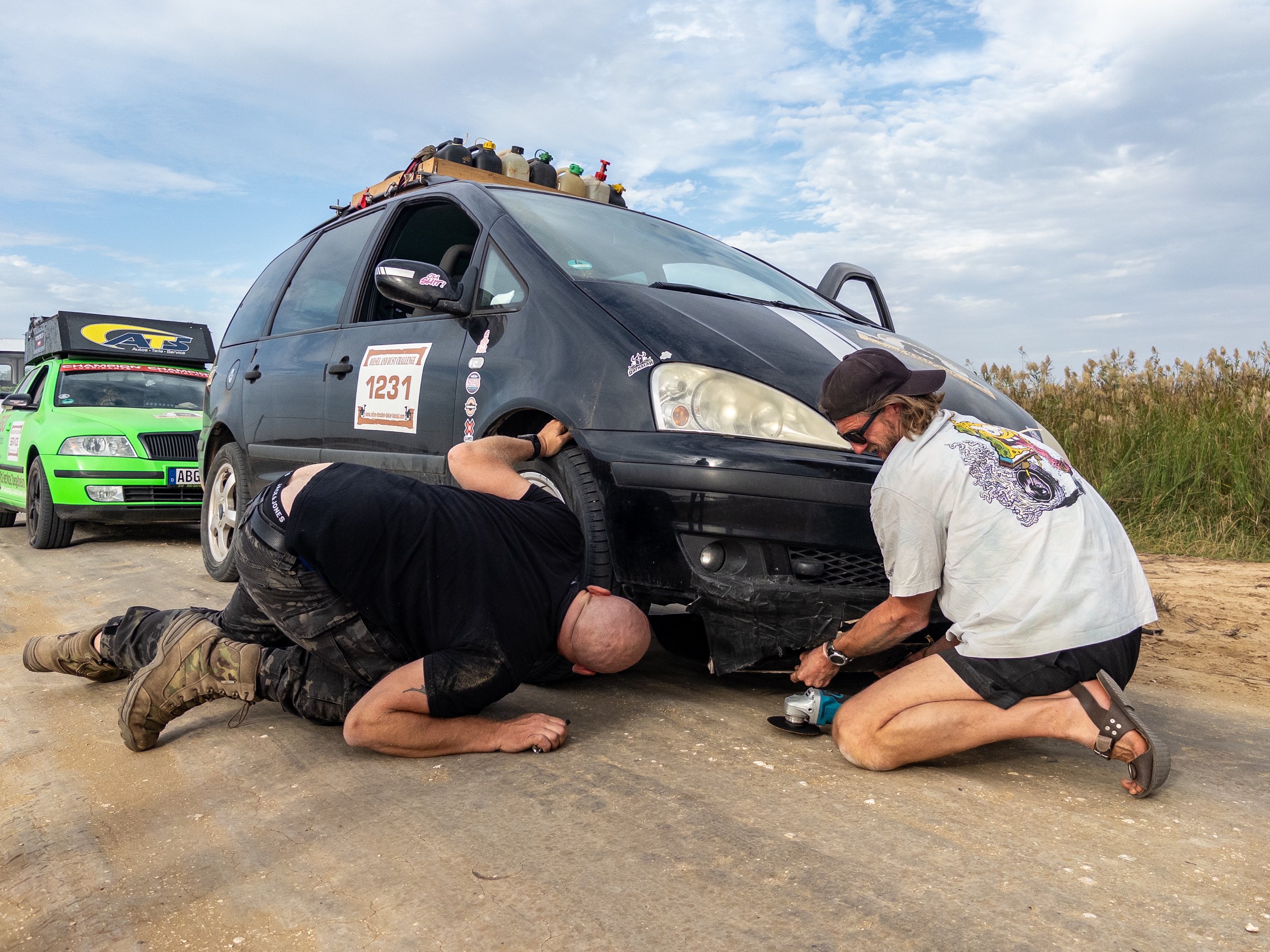 Auf dem Damm lockerte sich langsam, aber stetig, das Unterbodenblech am Ford Galaxy des Teams „Harian’s-Galaxy“, bis es schließlich kurz vor der Grenze abmontiert werden musste.