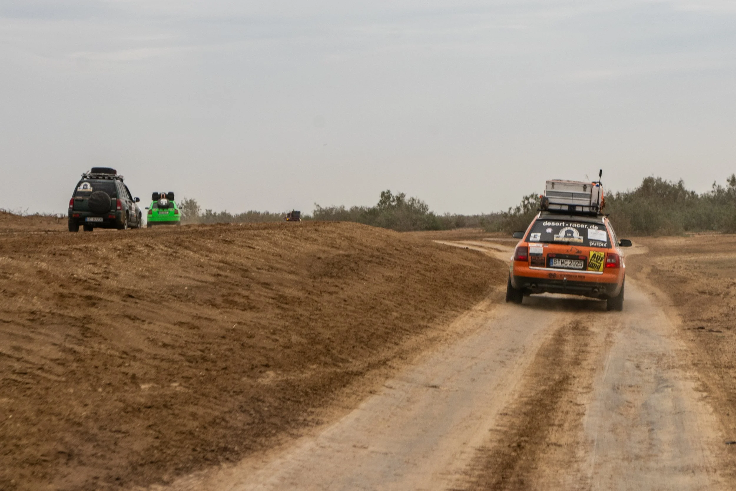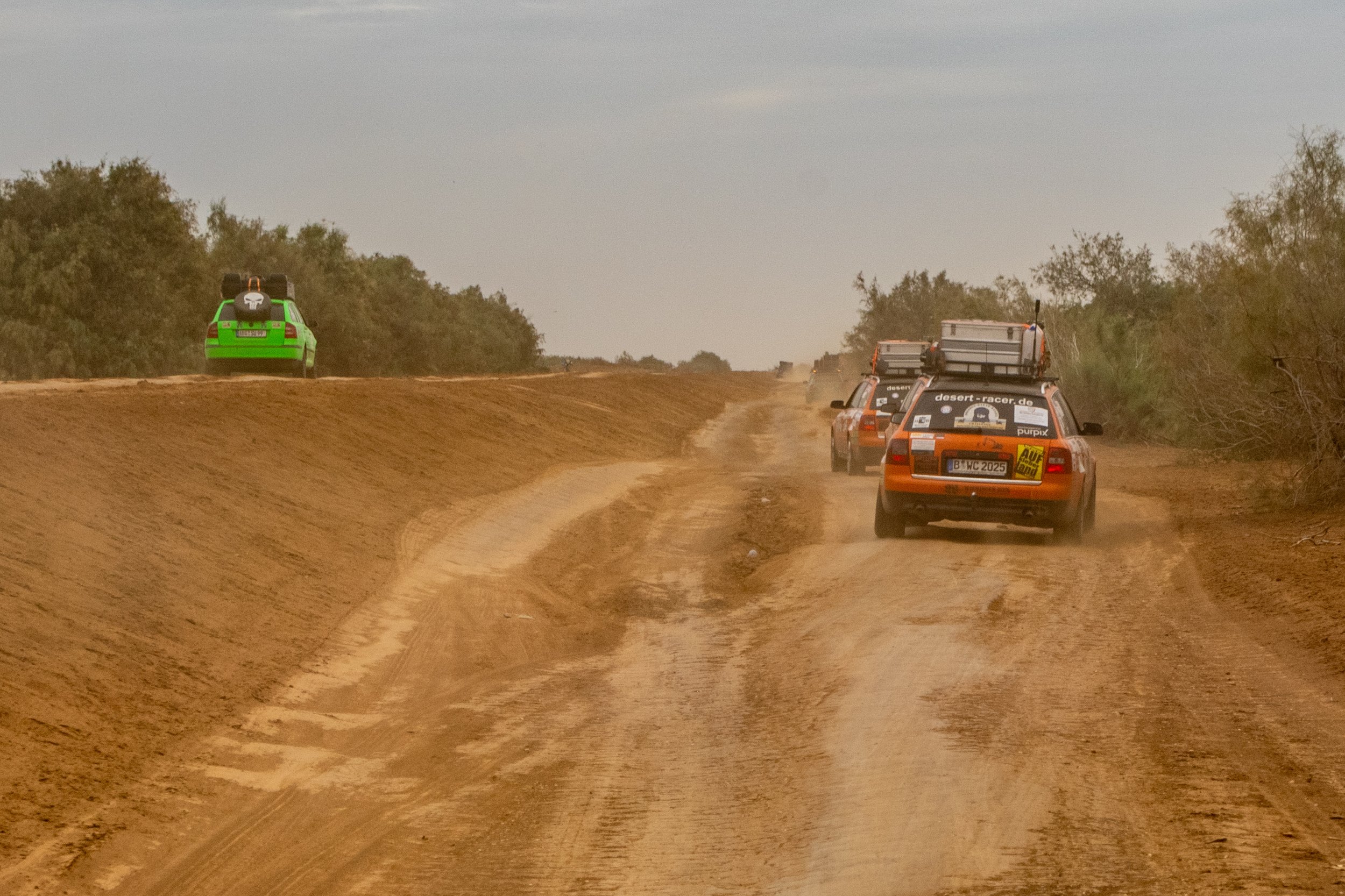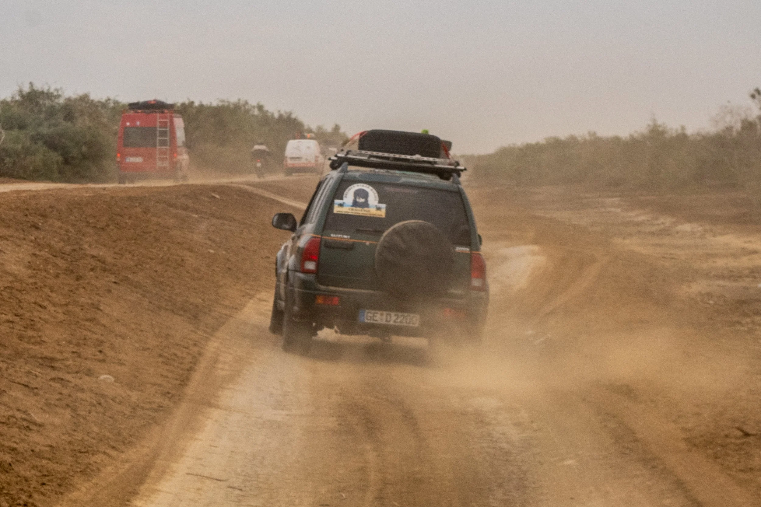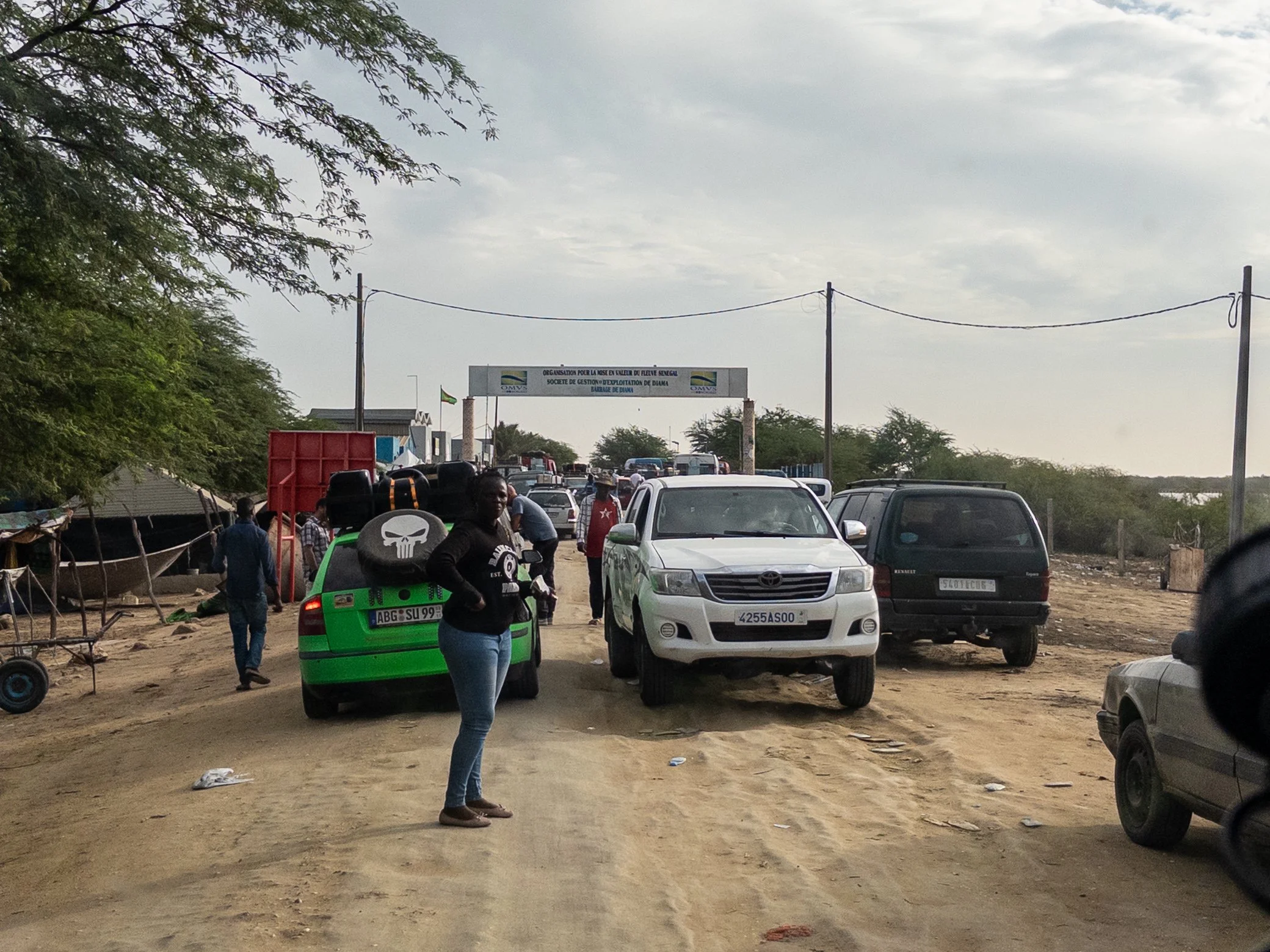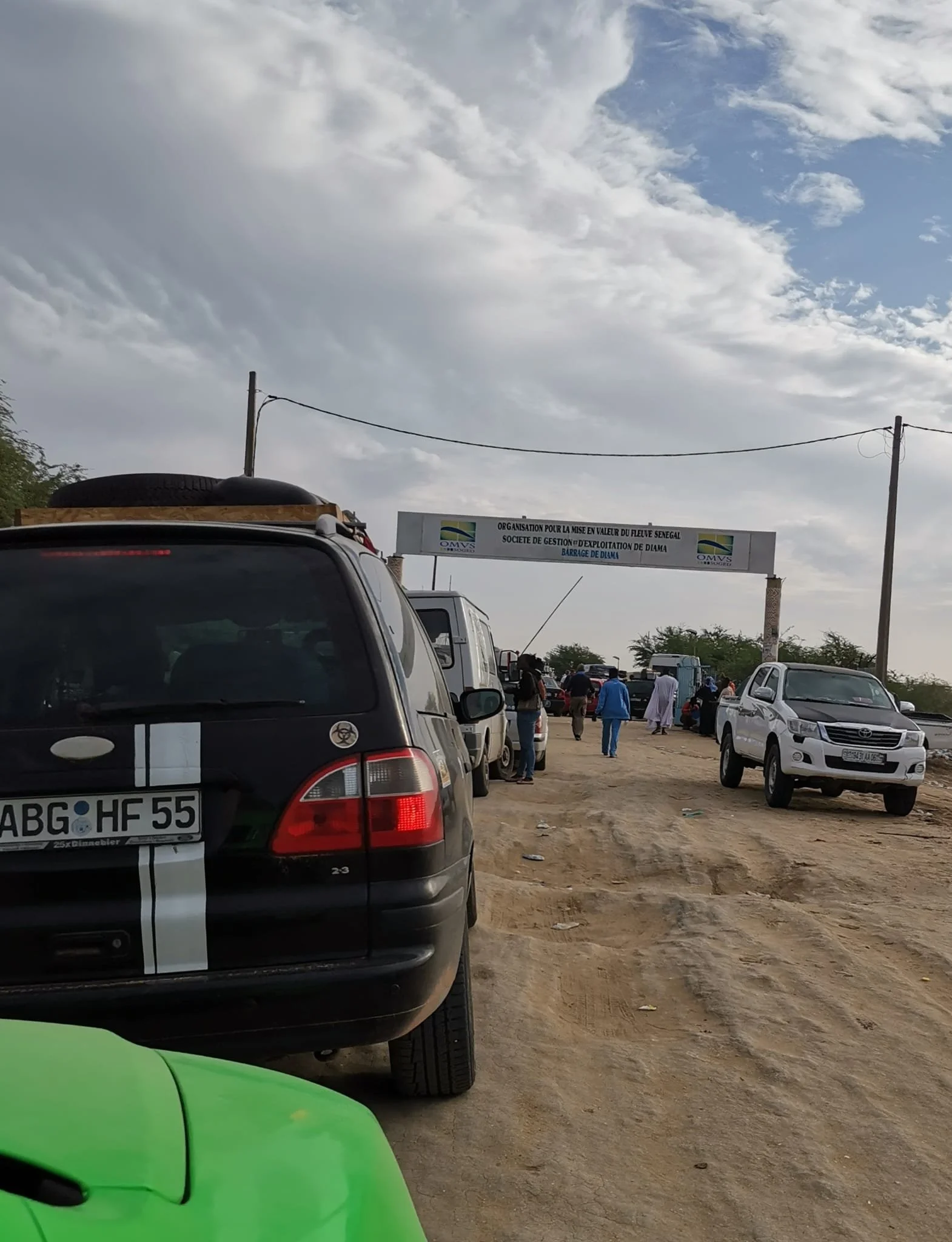 Unser Weg führte durch mehrere kleine Ortschaften in Richtung Grenze, vorbei an Kindern, die „Gadou“ (Geschenk) riefen und, wenn sie nichts bekamen, auch gern mal mit kleinen Steinen warfen – zwei Fahrzeugscheiben fanden das leider nicht so toll. Allmählich änderte sich auch die Landschaft, denn wir tauchten in die Sahelzone ein. Weiter ging es über einen Damm durch den Diawling-Nationalpark. Mit etwas Glück konnte man hier Warzenschweine, Warane und zahlreiche Vögel entdecken – oder man sah nur den Staub des vorausfahrenden Rallyefahrzeugs.