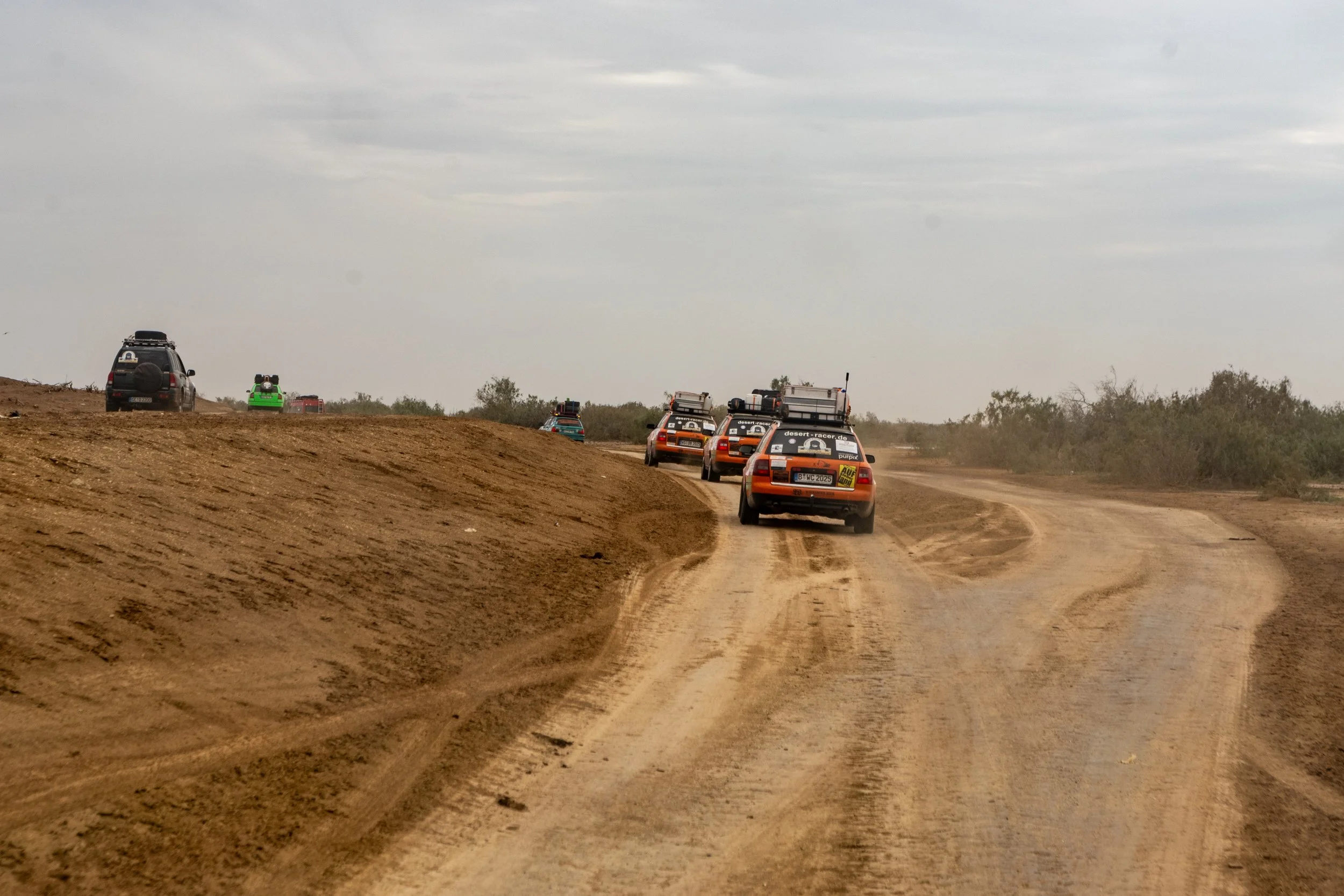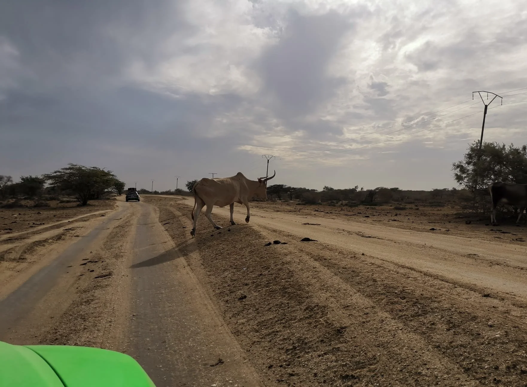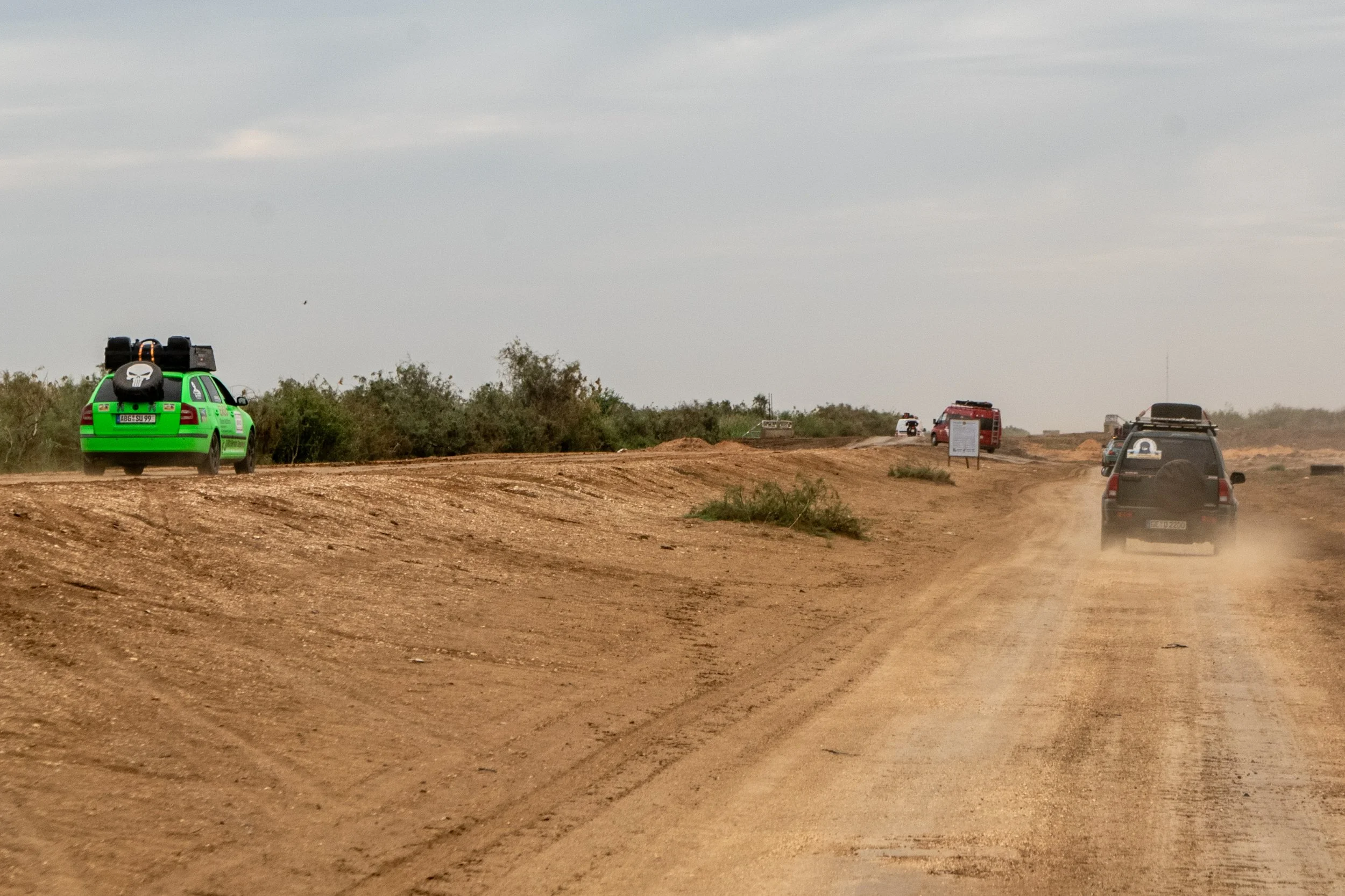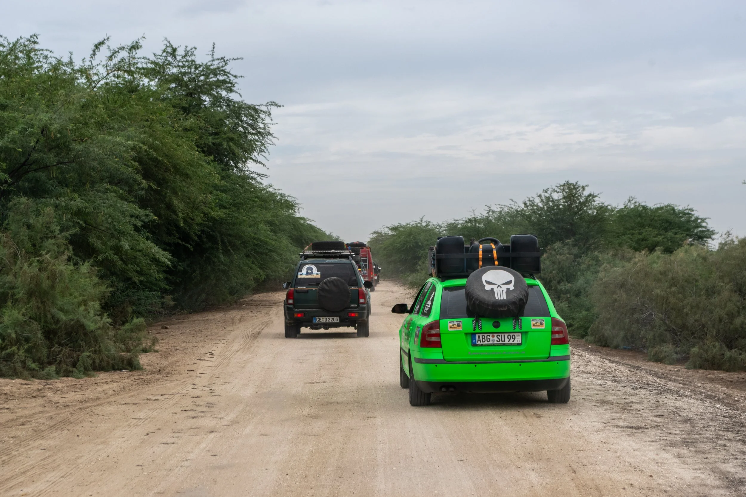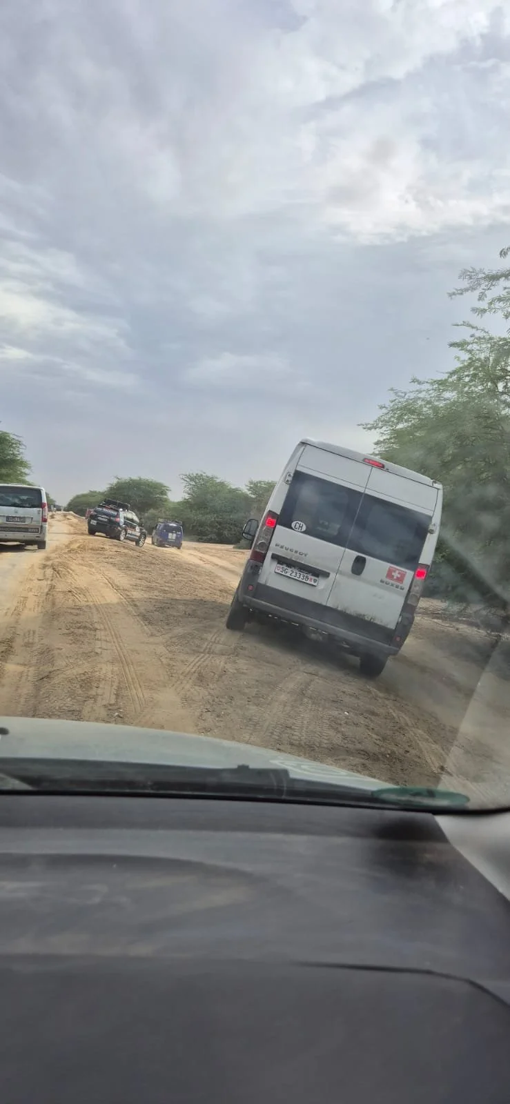Unser Weg führte durch mehrere kleine Ortschaften in Richtung Grenze, vorbei an Kindern, die „Gadou“ (Geschenk) riefen und, wenn sie nichts bekamen, auch gern mal mit kleinen Steinen warfen – zwei Fahrzeugscheiben fanden das leider nicht so toll. Allmählich änderte sich auch die Landschaft, denn wir tauchten in die Sahelzone ein. Weiter ging es über einen Damm durch den Diawling-Nationalpark. Mit etwas Glück konnte man hier Warzenschweine, Warane und zahlreiche Vögel entdecken – oder man sah nur den Staub des vorausfahrenden Rallyefahrzeugs.
