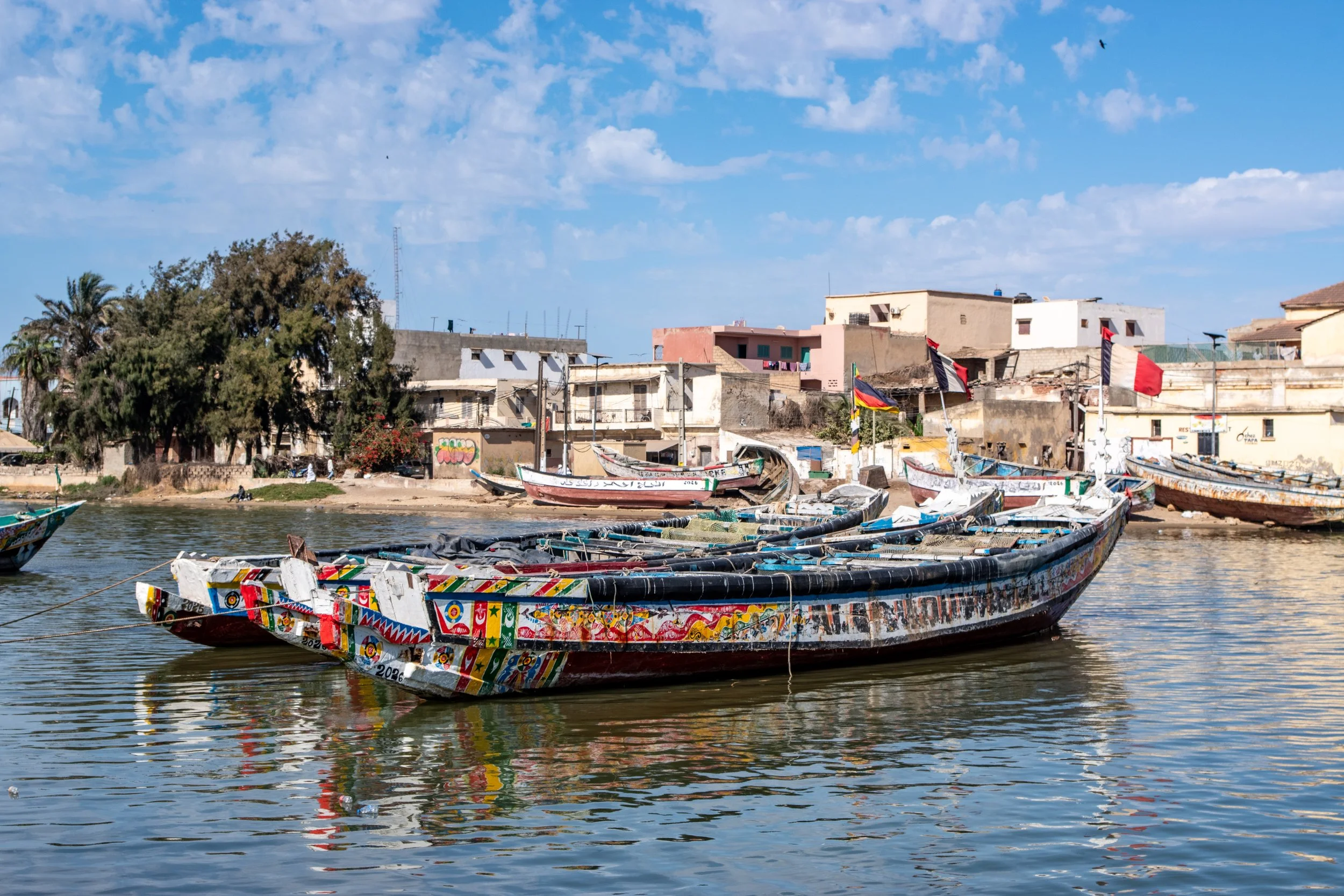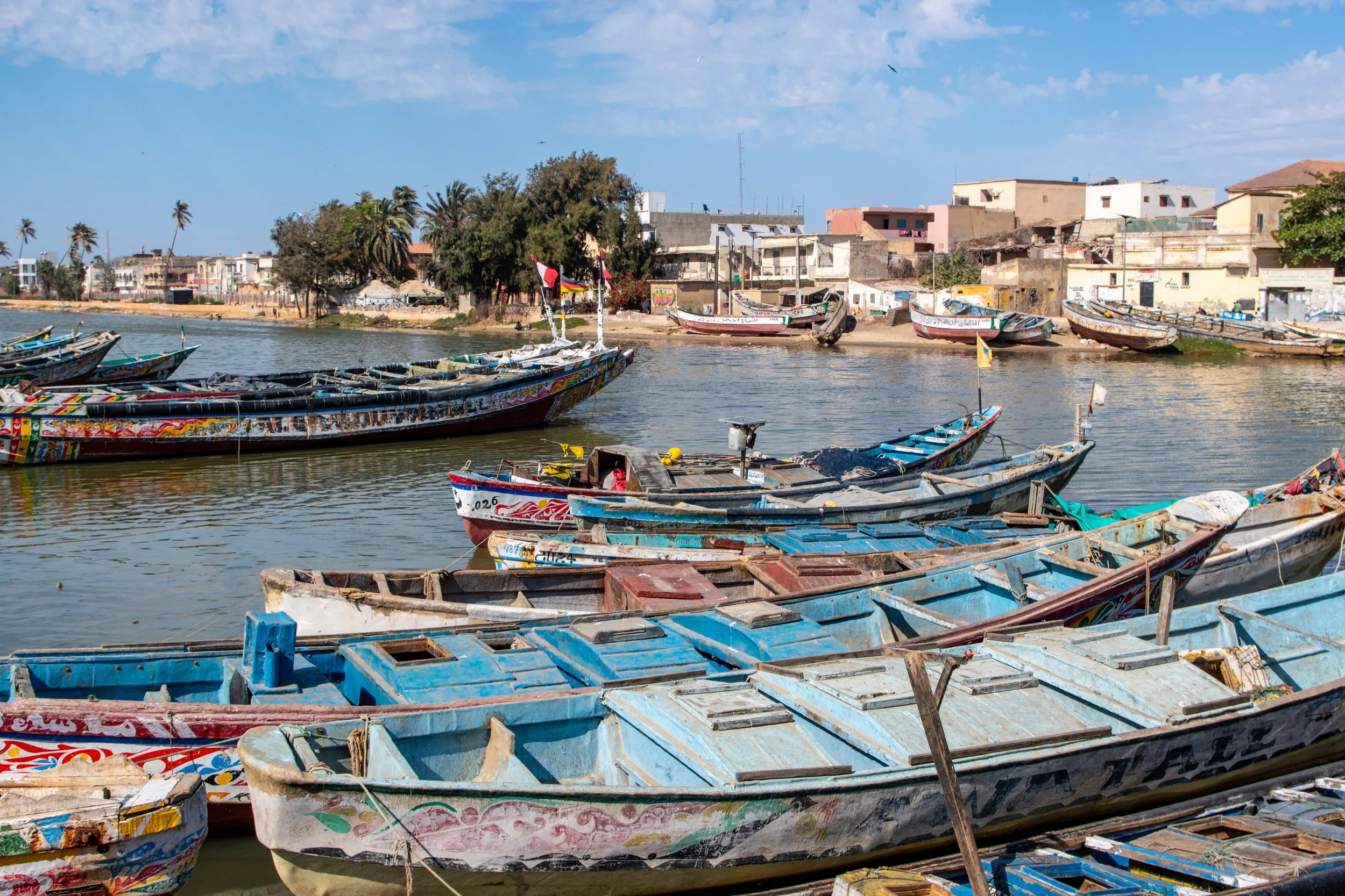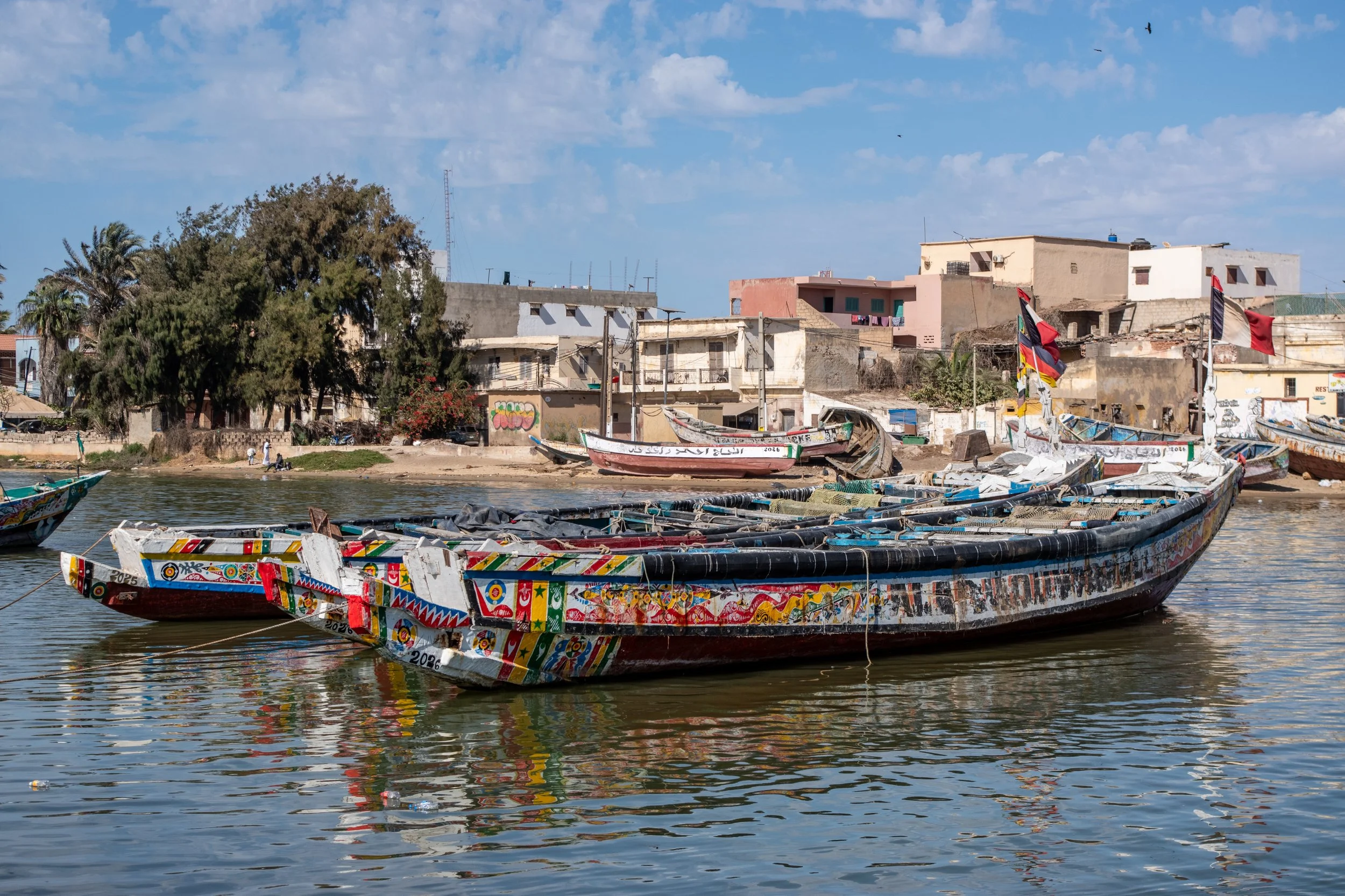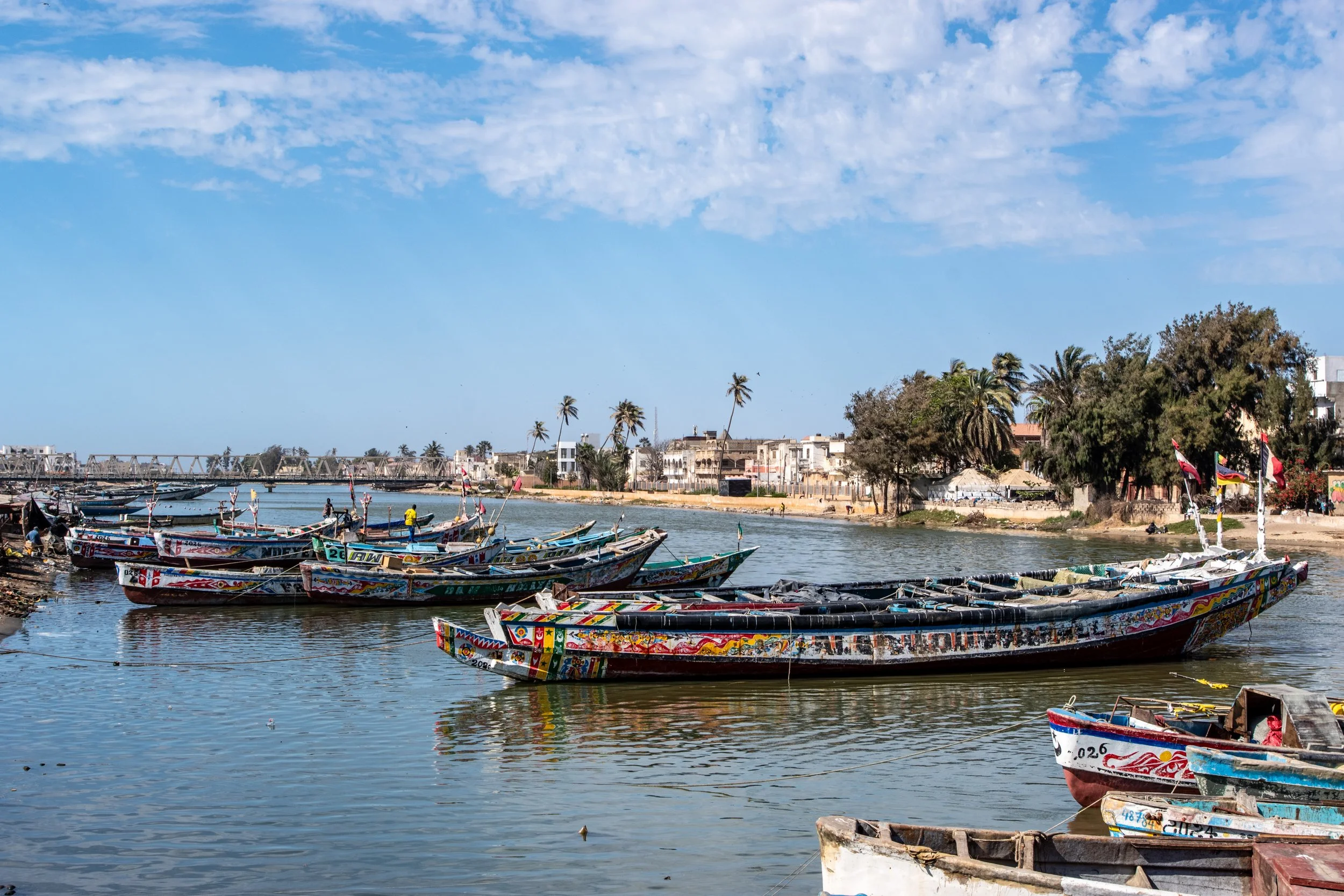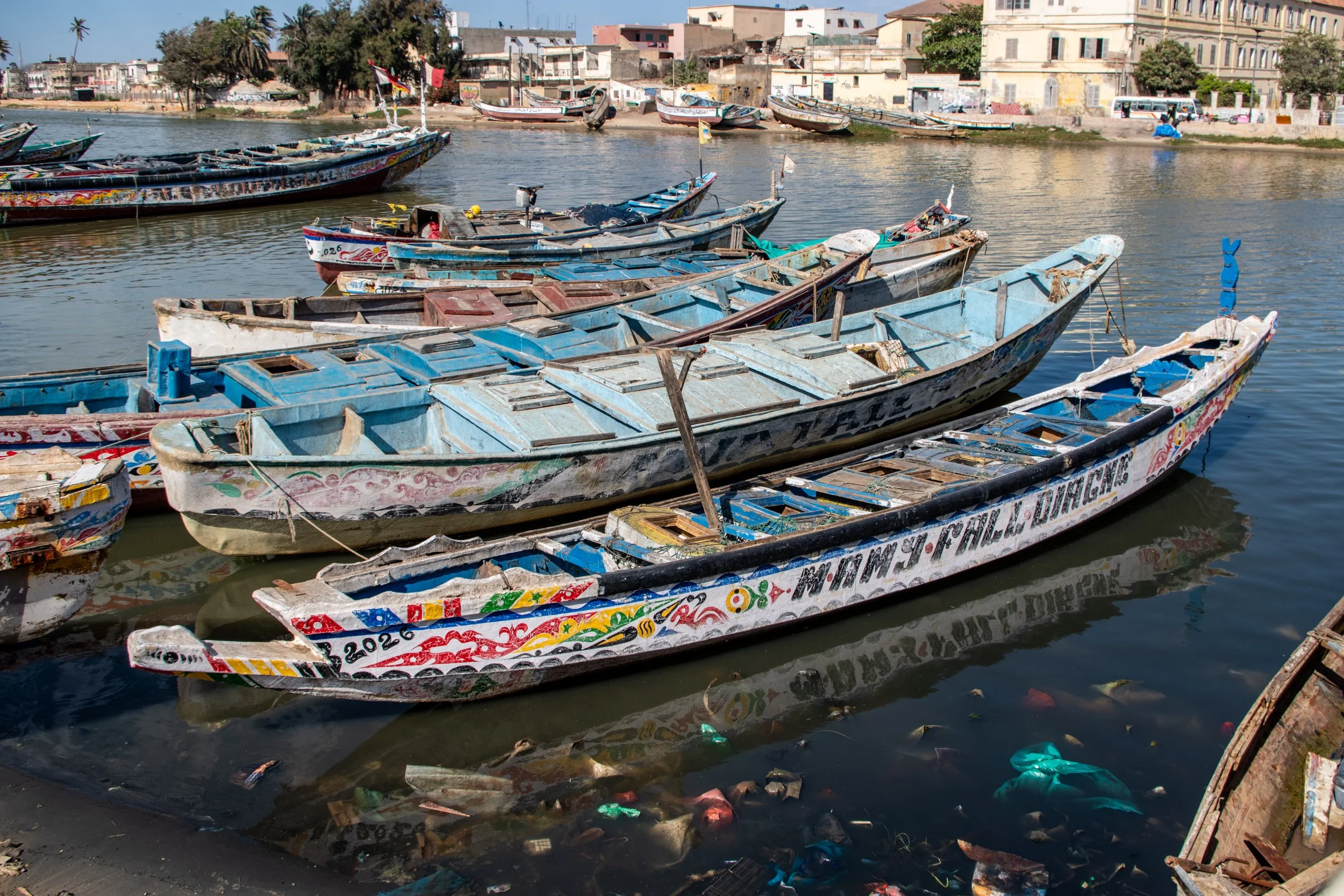 Auf dem Senegal River liegen zwischen der Insel Île de Saint-Louis und der Landzunge Langue de Barbarie dicht an dicht bunt bemalte Boote. Dazwischen eilen geschäftig Menschen umher, während Fischer ihre Netze flicken oder sich für den Fang des Tages bereitmachen.