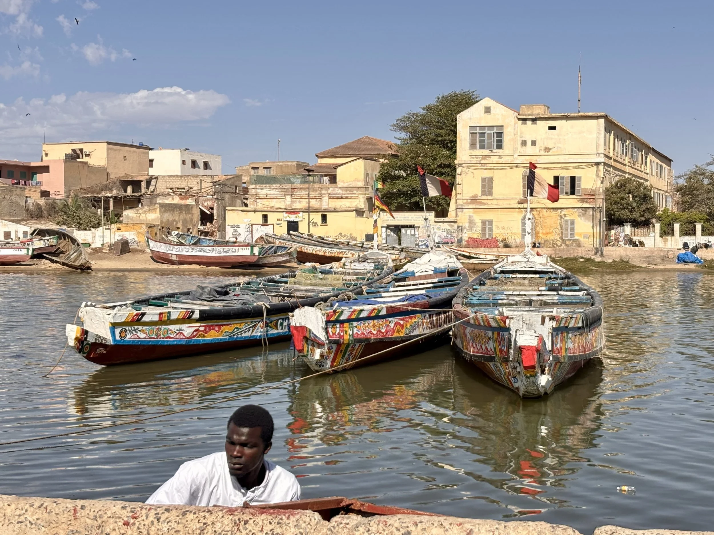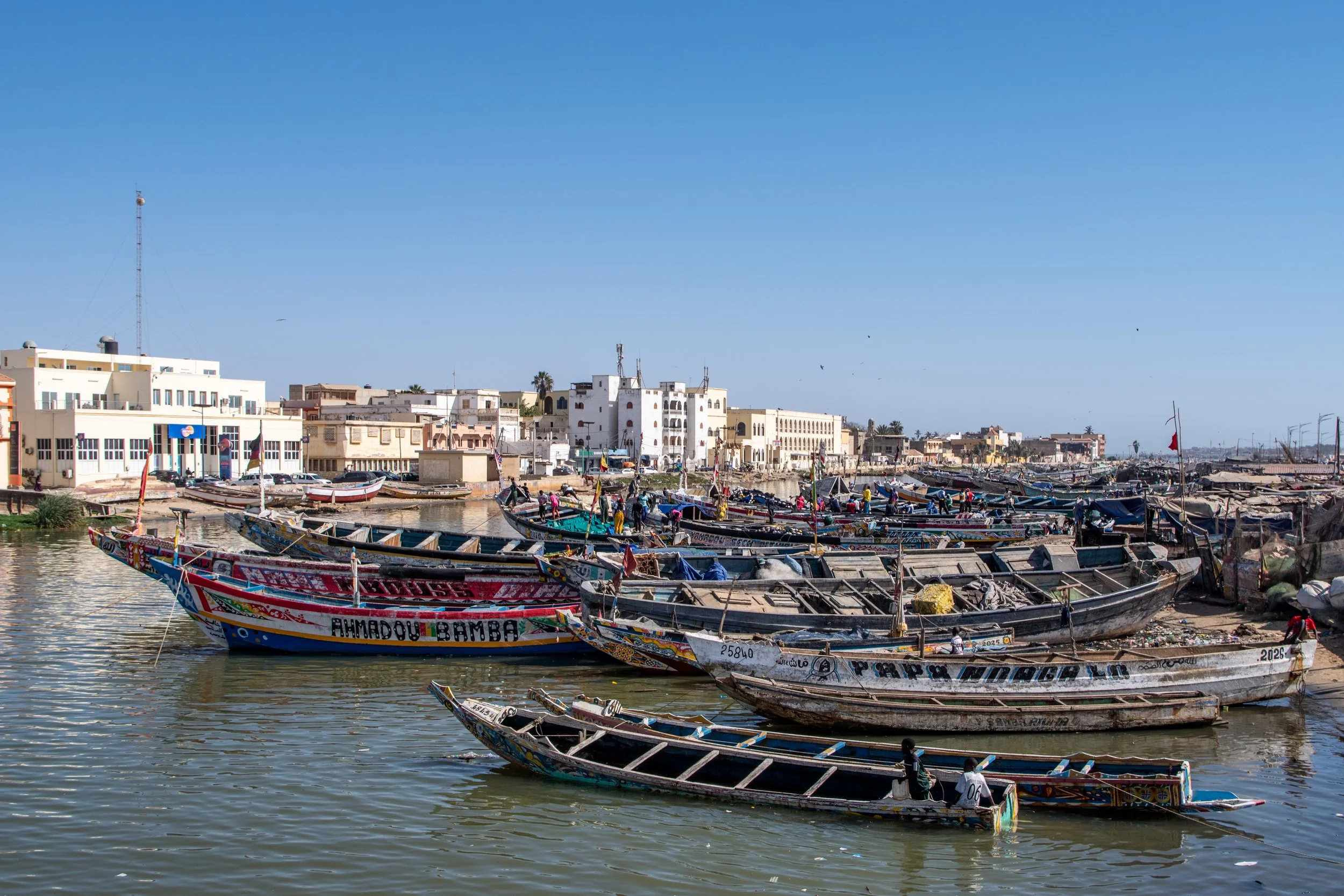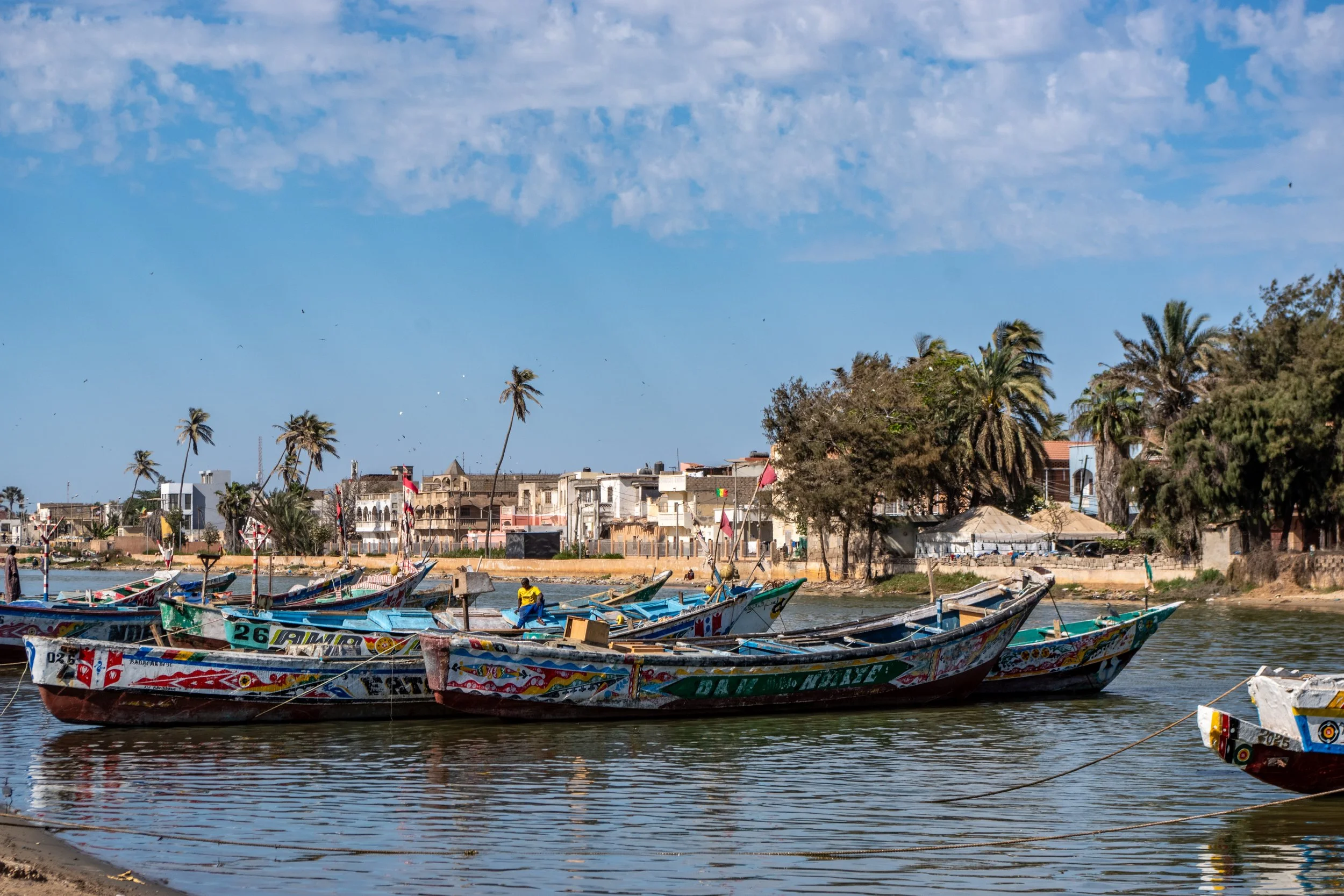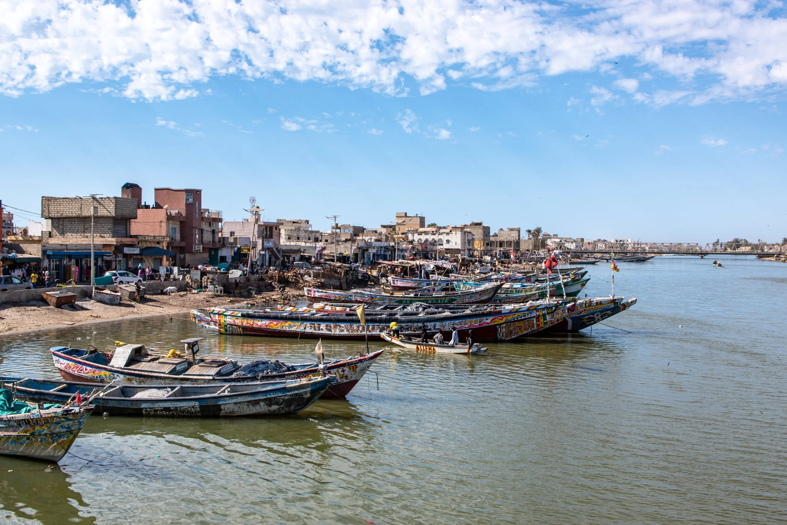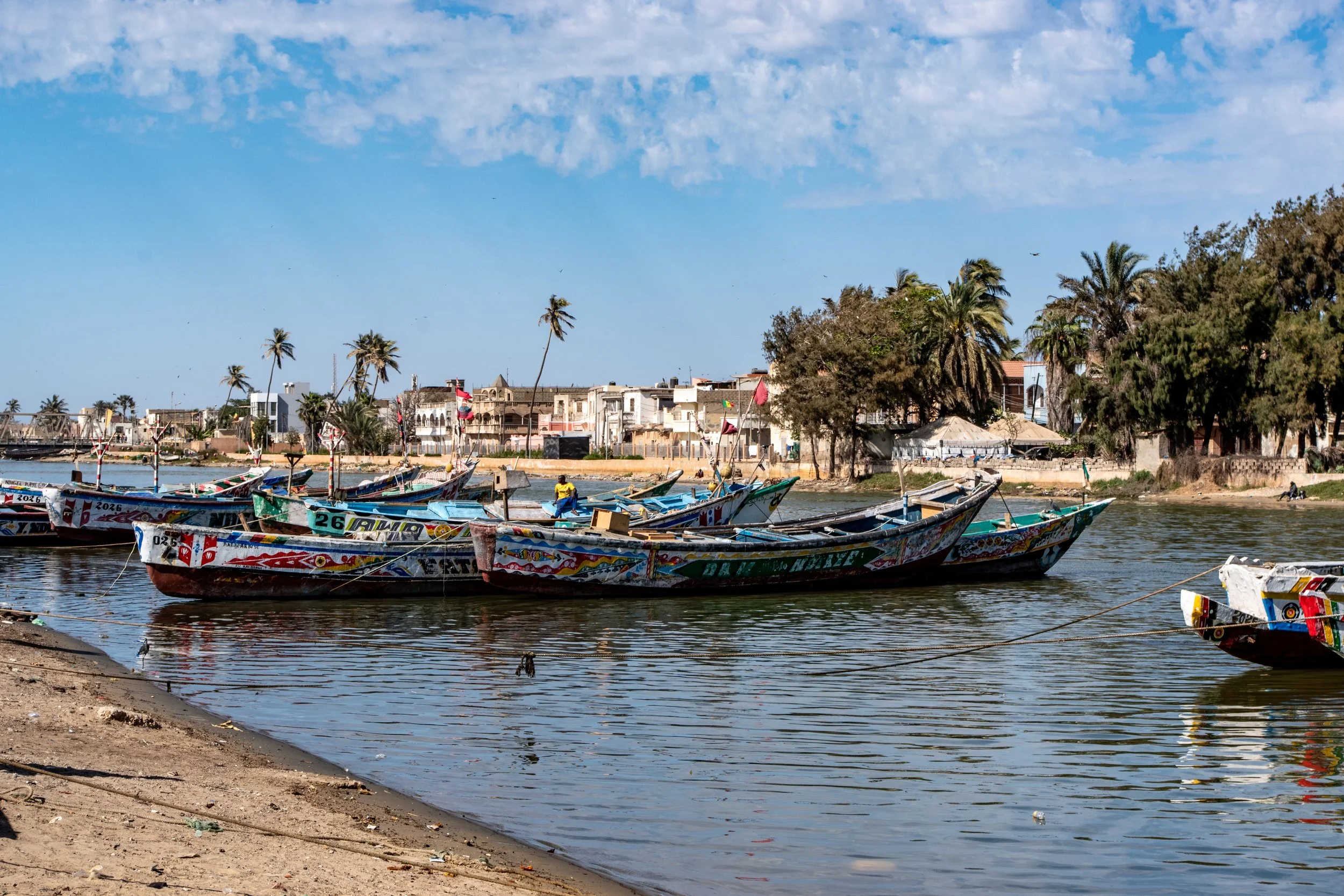 Auf dem Senegal River liegen zwischen der Insel Île de Saint-Louis und der Landzunge Langue de Barbarie dicht an dicht bunt bemalte Boote. Dazwischen eilen geschäftig Menschen umher, während Fischer ihre Netze flicken oder sich für den Fang des Tages bereitmachen.