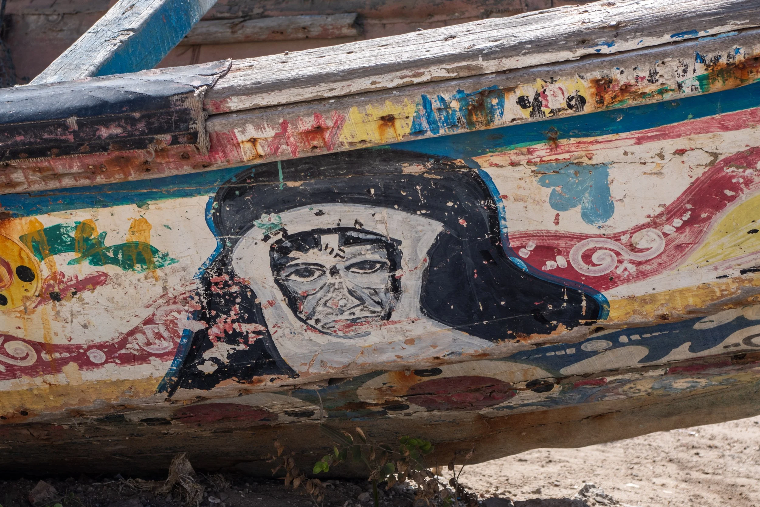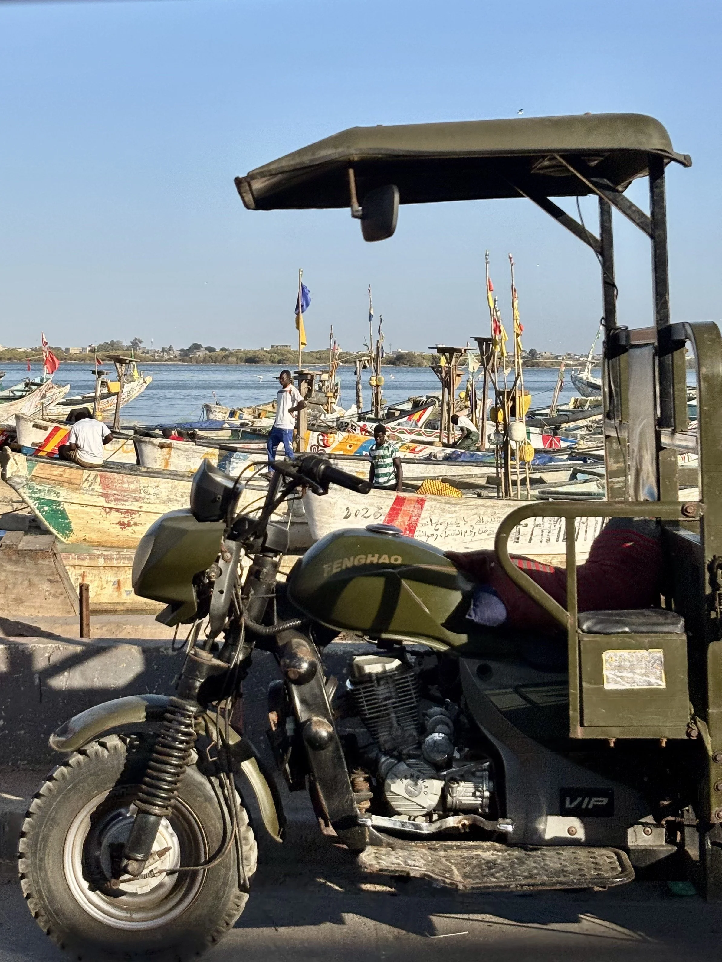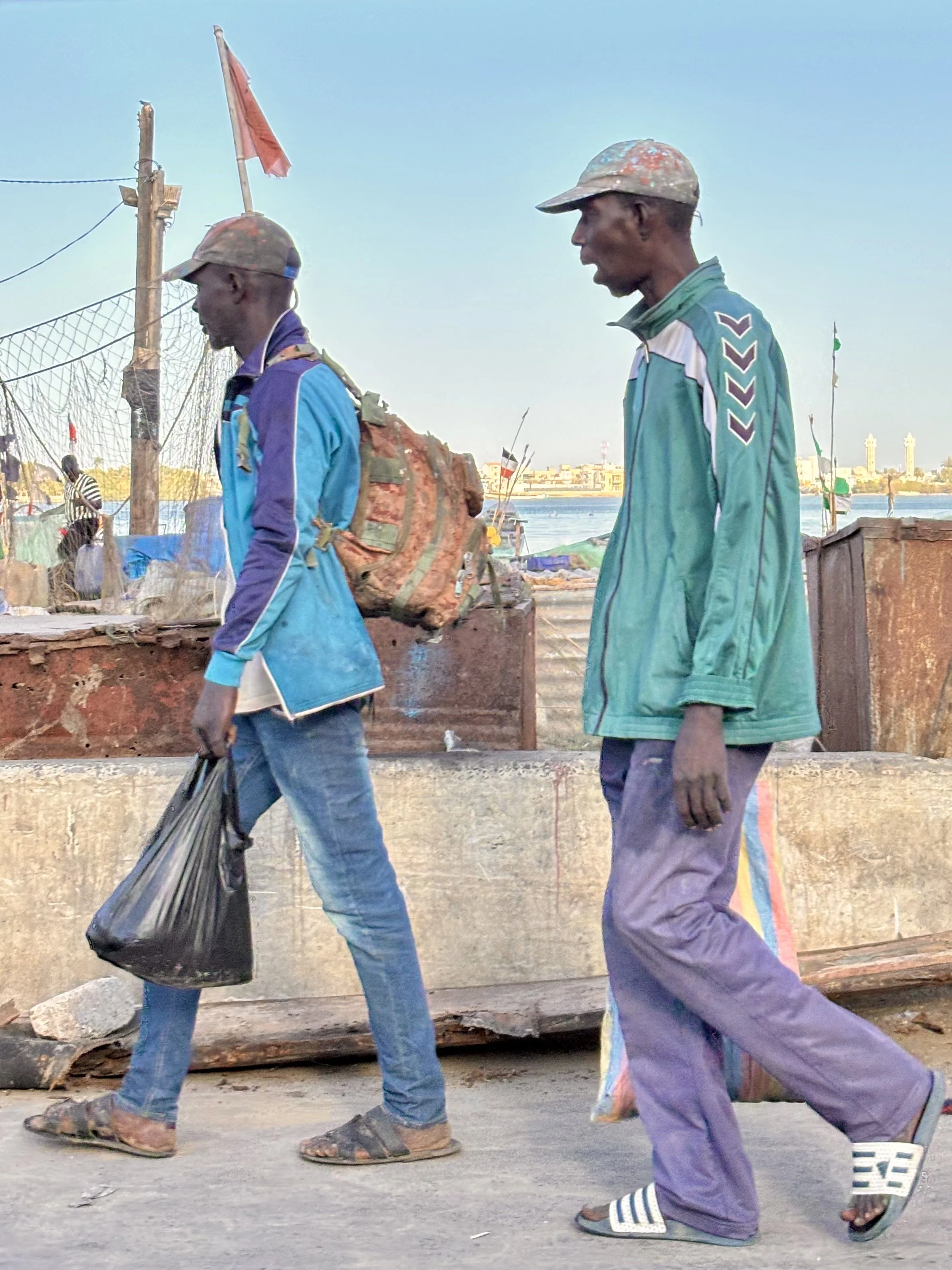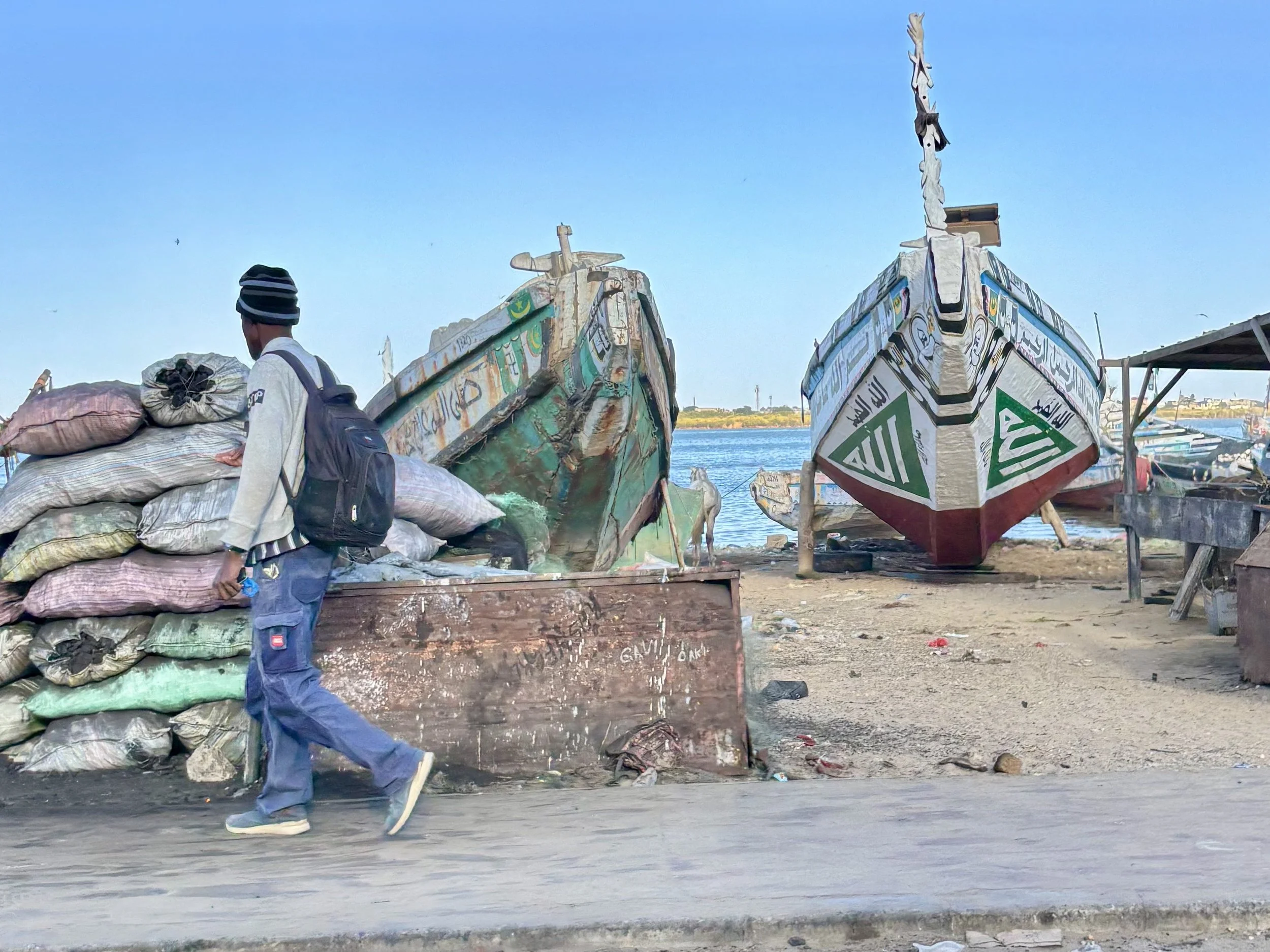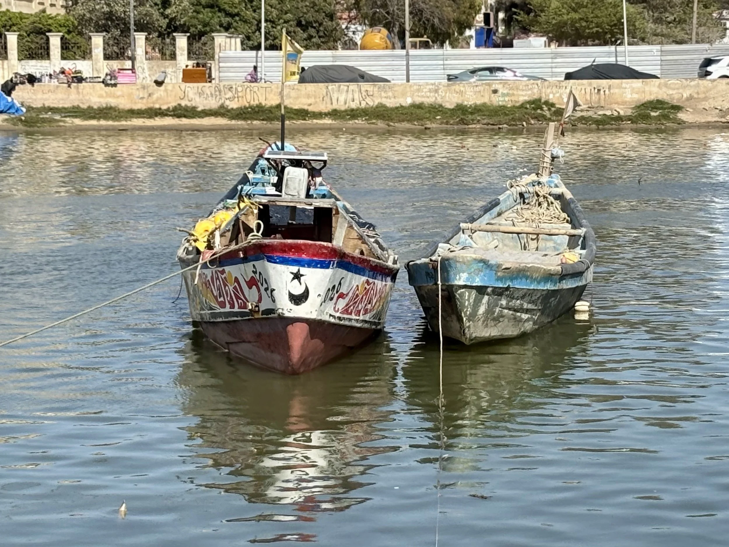 Auf dem Senegal River liegen zwischen der Insel Île de Saint-Louis und der Landzunge Langue de Barbarie dicht an dicht bunt bemalte Boote. Dazwischen eilen geschäftig Menschen umher, während Fischer ihre Netze flicken oder sich für den Fang des Tages bereitmachen.