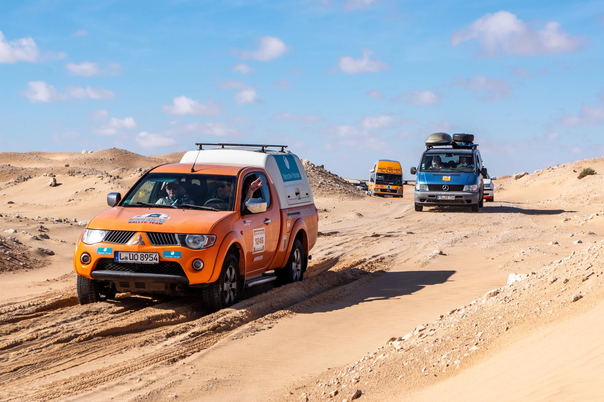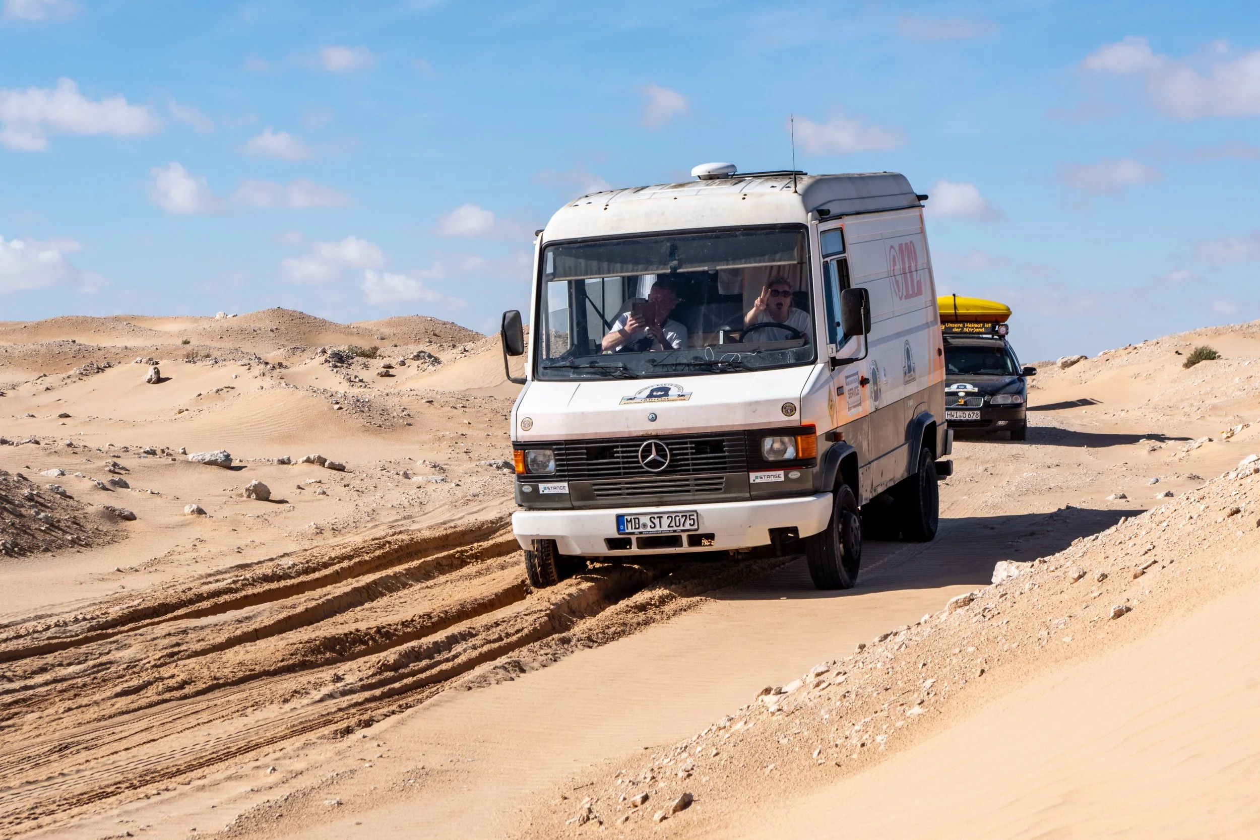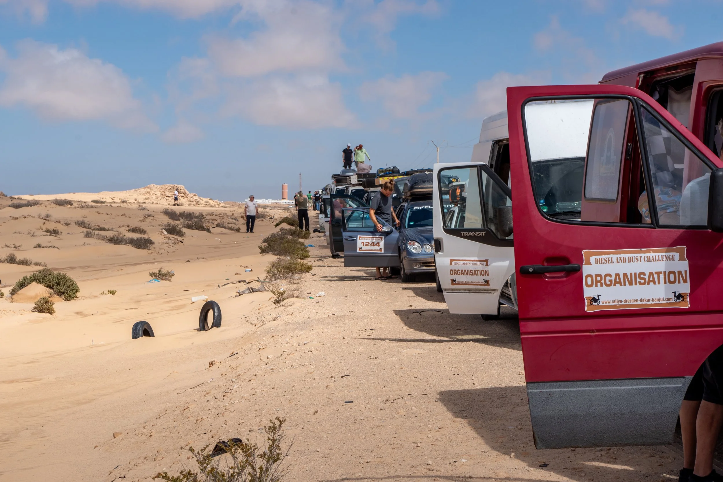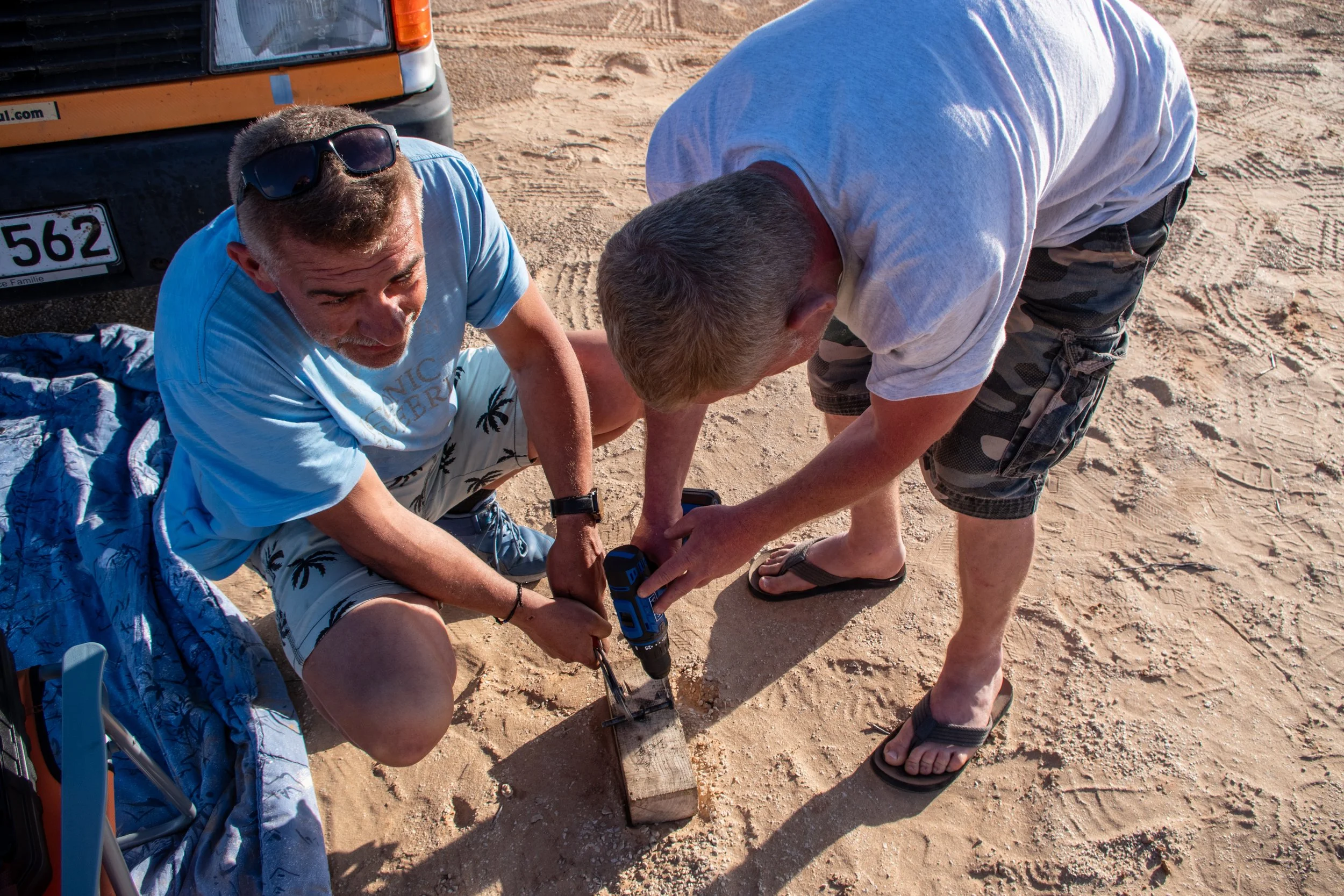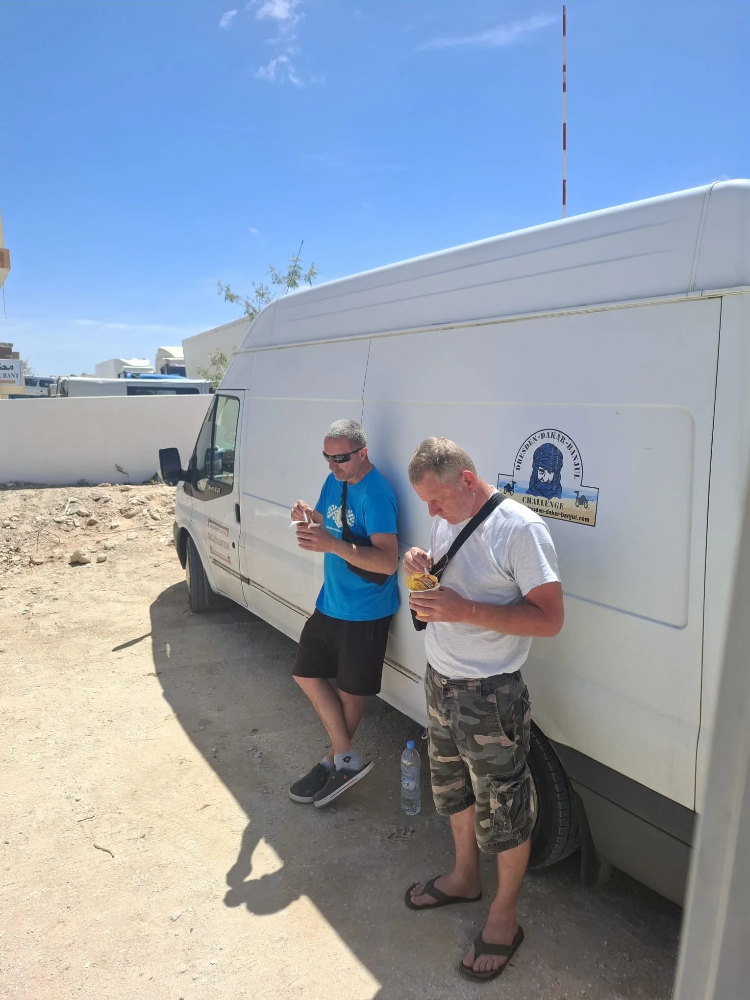 Um sich die Wartezeit ein wenig zu verkürzen bastelte Dirk (Team „VIATEC Altenburg“) etwas an seinem Mercedes MB 100 herum. Die Lichtmaschine drohte sich zu verabschieden. Ein Befestigungsbolzen war aufgrund von Materialermüdung abgebrochen. Vorerst wurde sie notdürftig fixiert. Die endgültige Reparatur – es wurde eine alternative Befestigung konstruiert – erfolgte später an der ‚Versteckten Düne‘.