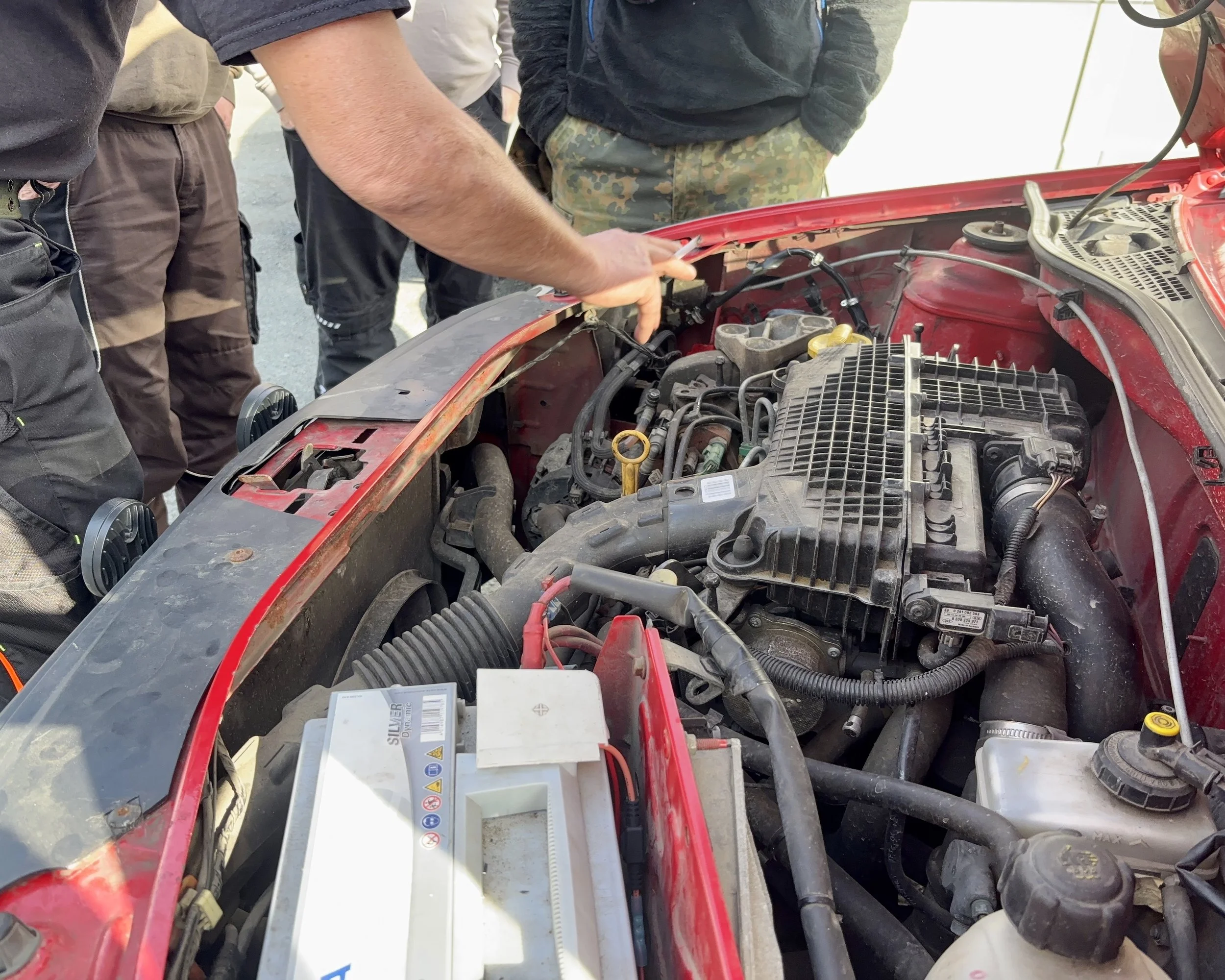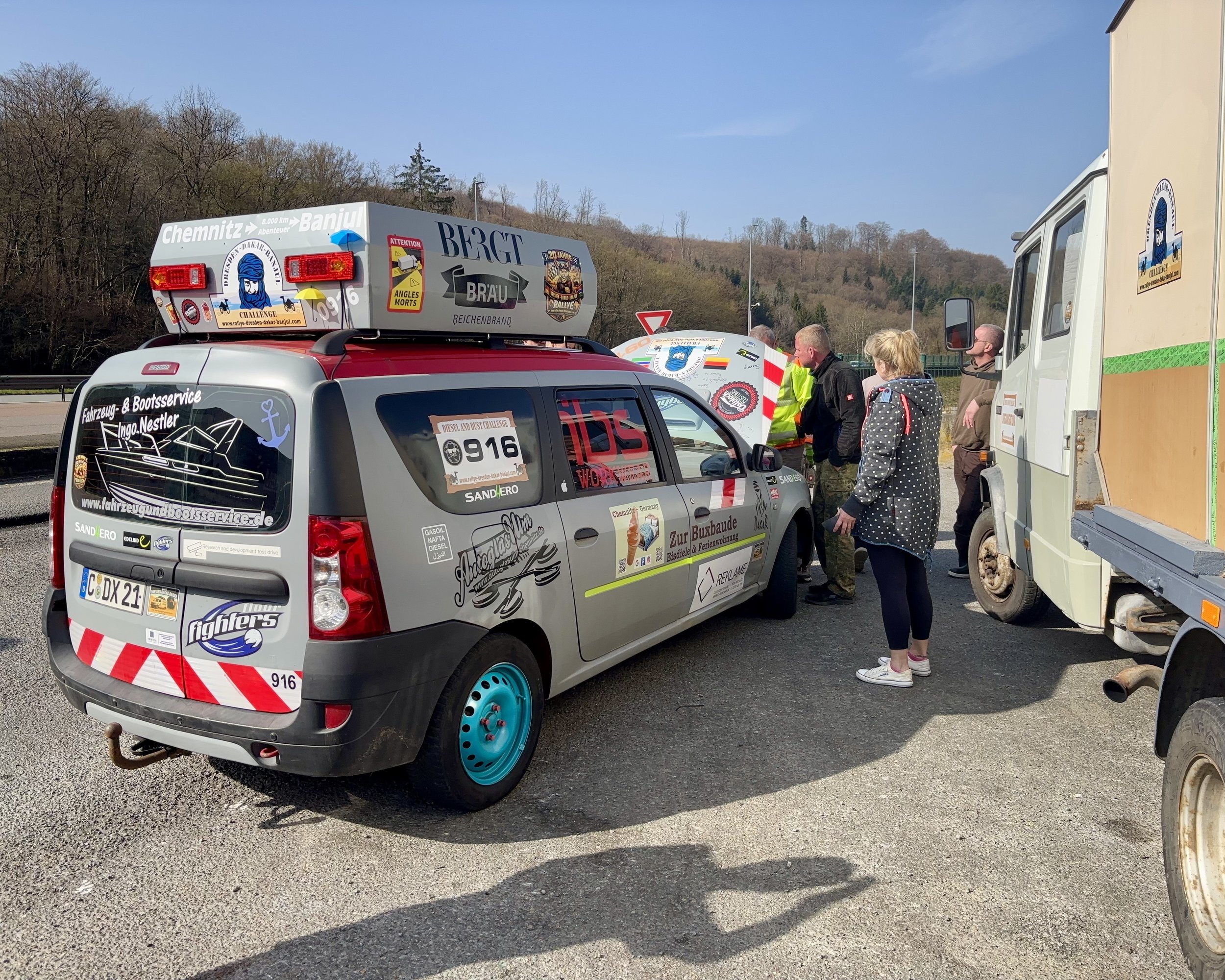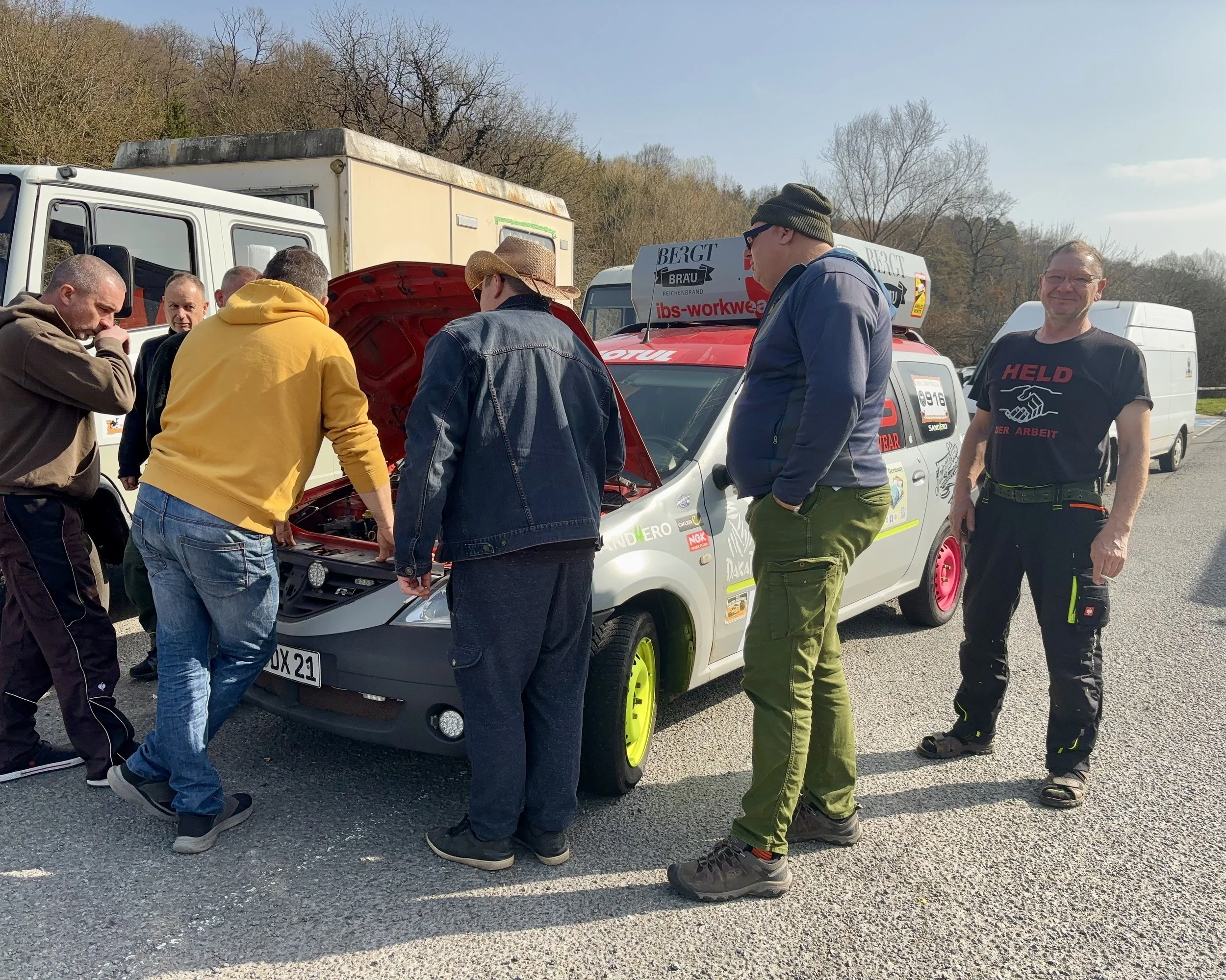 Der Dacia von Team „Sand(h)ero“ kämpfte heute mit Problemen im Kraftstoffsystem - er zieht Luft. Es wurde schon mehrmals versucht, das Problem zu beheben. Morgen muss wohl ein neuer Dieselfilter gekauft und eingebaut werden.