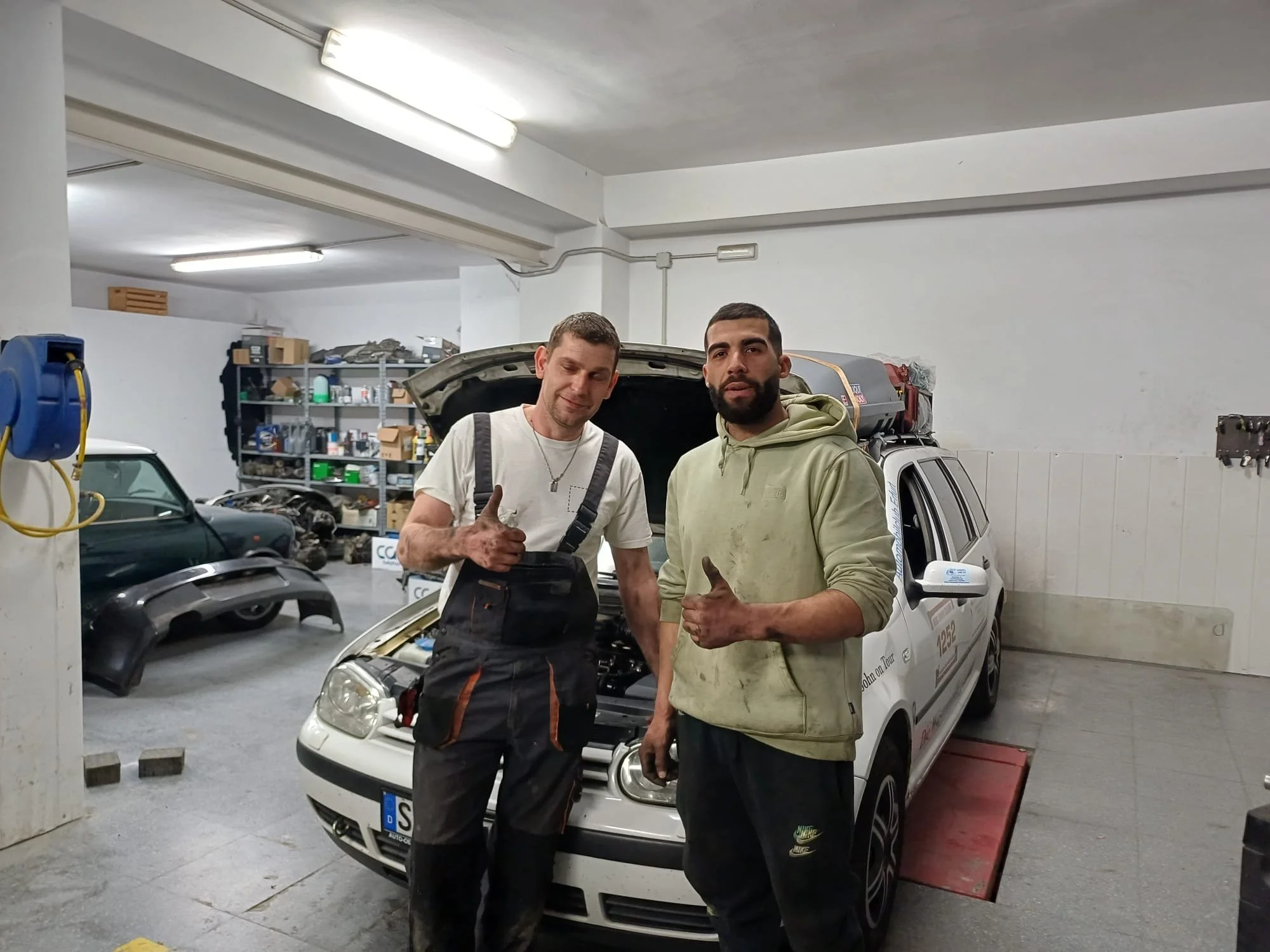 Der VW Golf4 von Team „Wüstenwölfe Vater&Sohn on Tour“ hatte heute Probleme mit dem Turbolader, ein abgerissener Schlauch. In einer (O-Ton: „Super“)-Werkstatt wurde der passende Schlauch vom Werkstattbesitzer aus einem Kunden-Auto ausgebaut und in den VW Golf4 eingebaut.