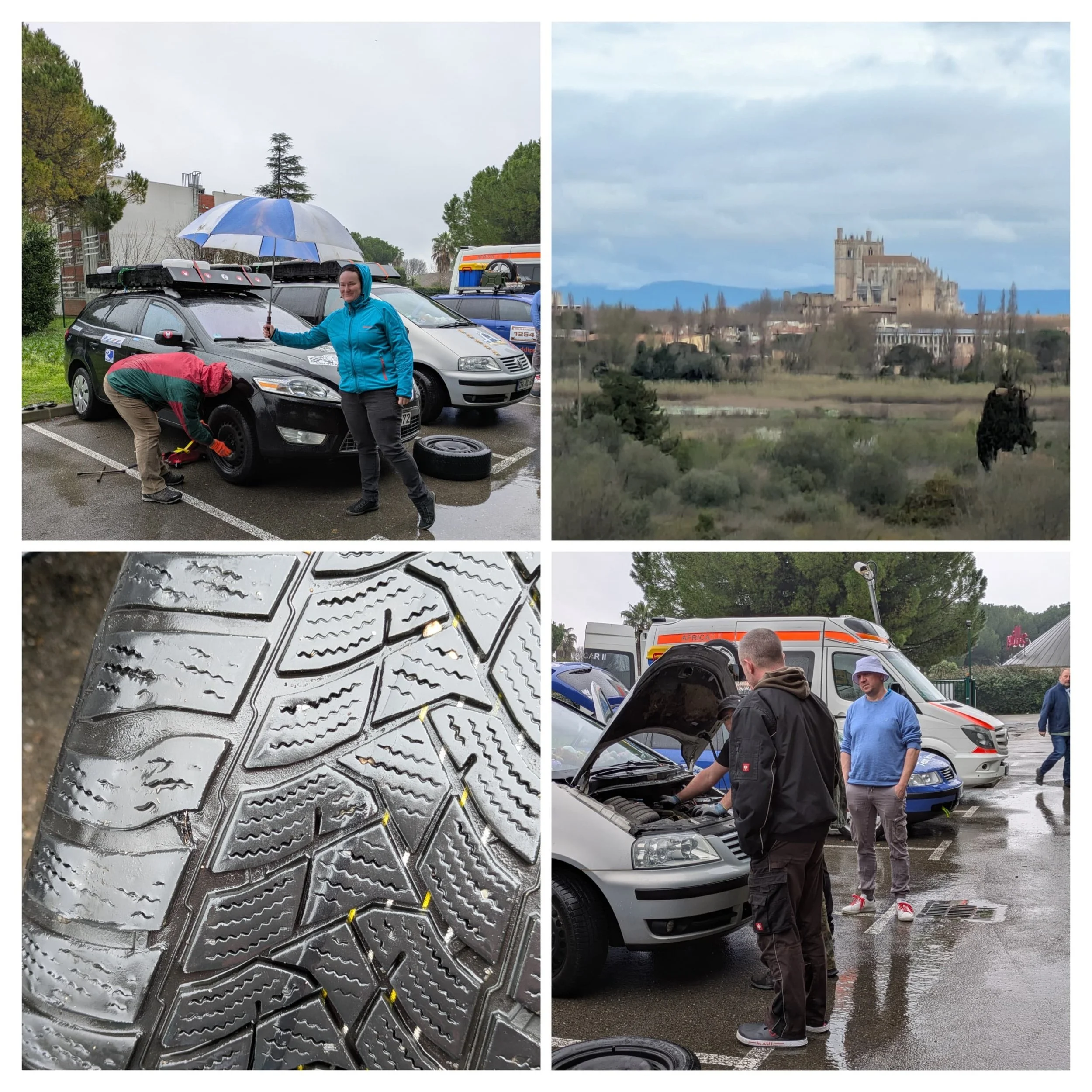 Der Tag begann für viele mit Regen. Also keine gute Konstellation zum Schrauben an Rallye-Fahrzeugen. Und so wurde nur schnell der Reifen am Ford Mondeo (Team „Kirchbikes 1“) gewechselt und anschließend Nîmes verlassen.