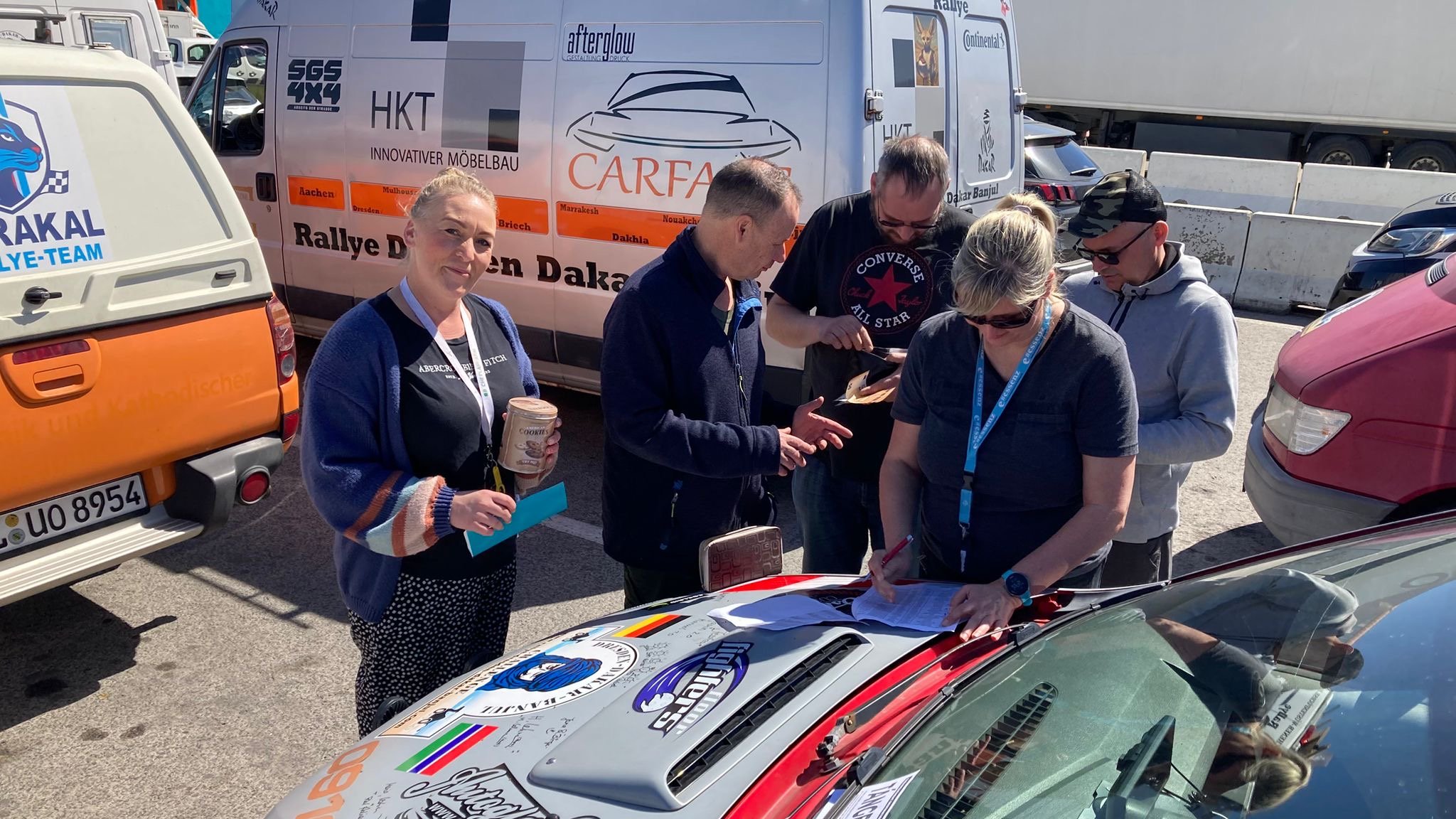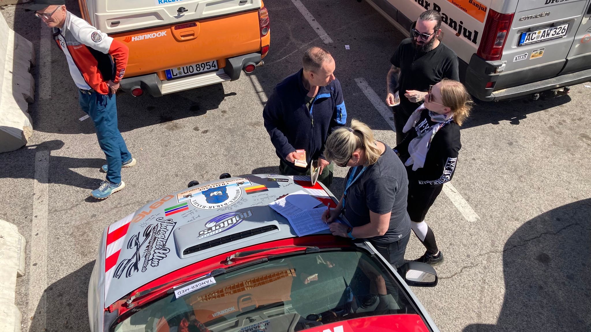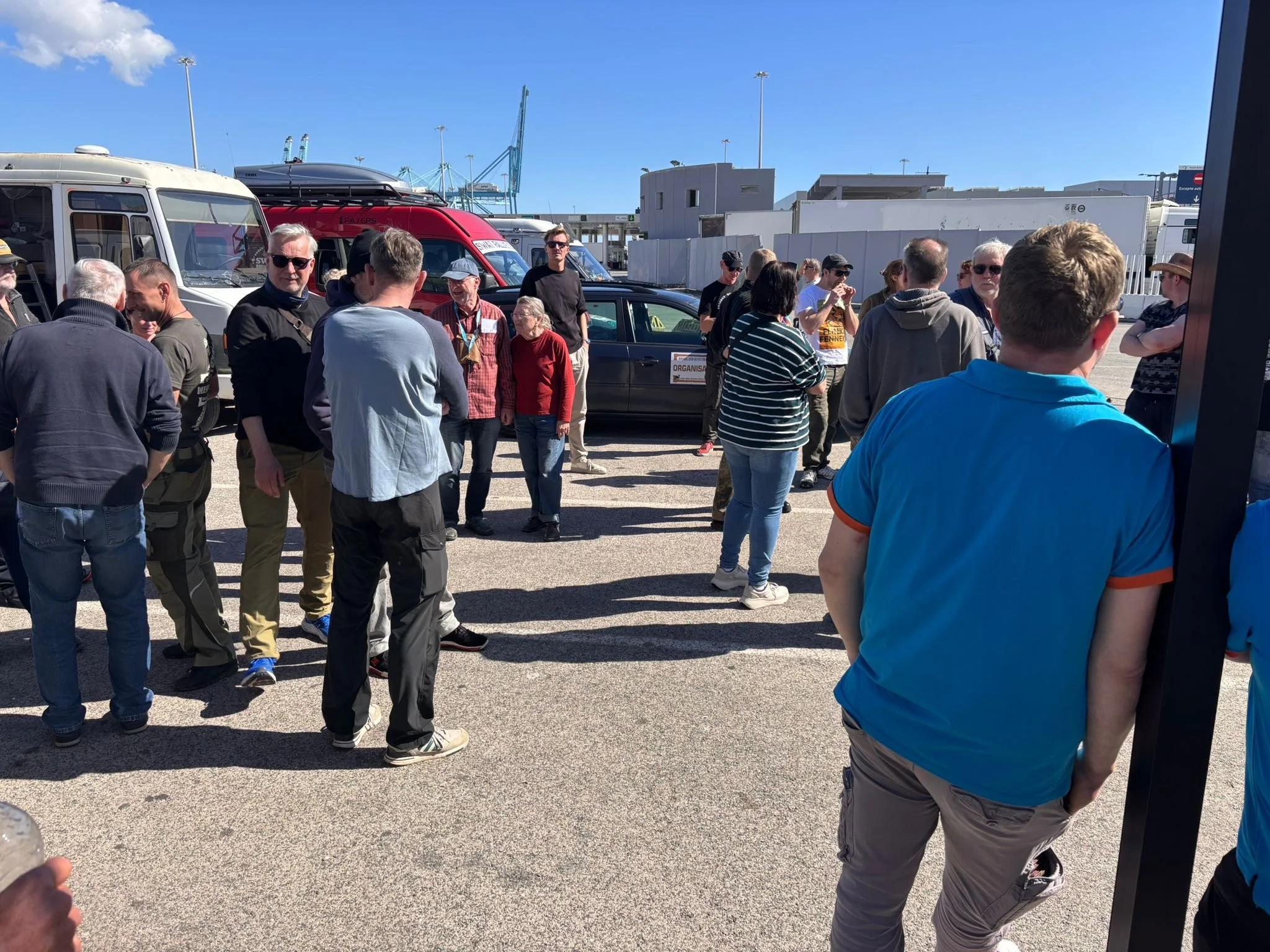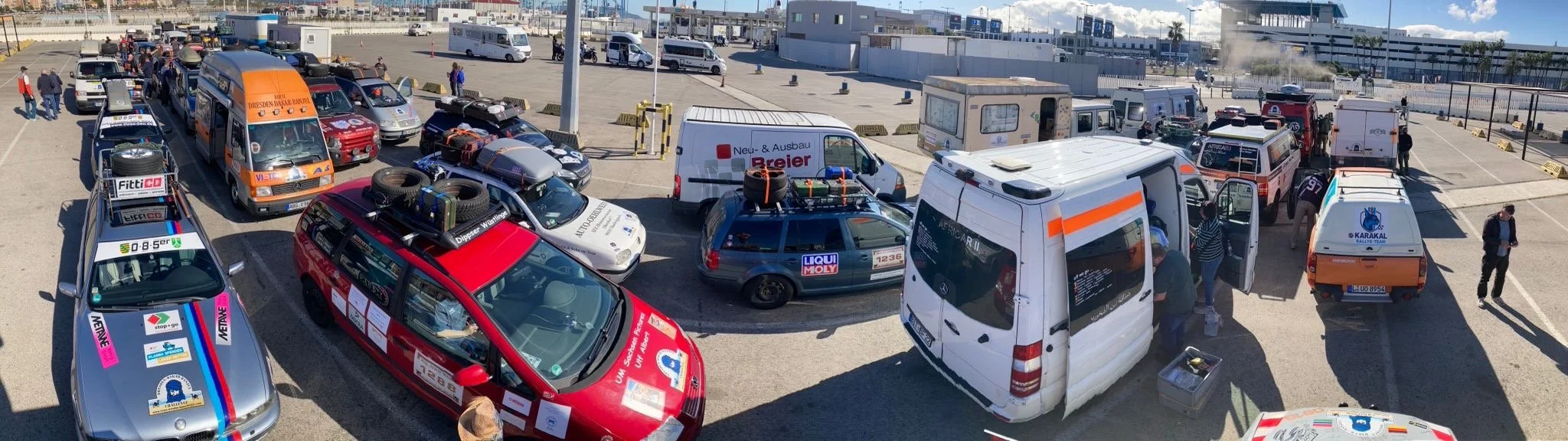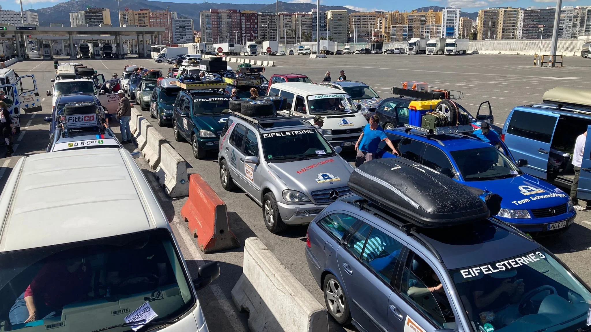 Die Zeit zwischen der Ankunft im Hafen und dem Ablegen der Fähre wurde für ein Briefing und zum näheren Kennenlernen genutzt. Schließlich trafen hier zum ersten Mal fast alle Teams aufeinander. Fünf Teams waren bereits vor ein paar Tagen nach Marokko eingereist und das Team „Ostblock-Customs“ musste noch auf Ersatzteile warten. Sie wollten aber die letzte Fähre heute schaffen.