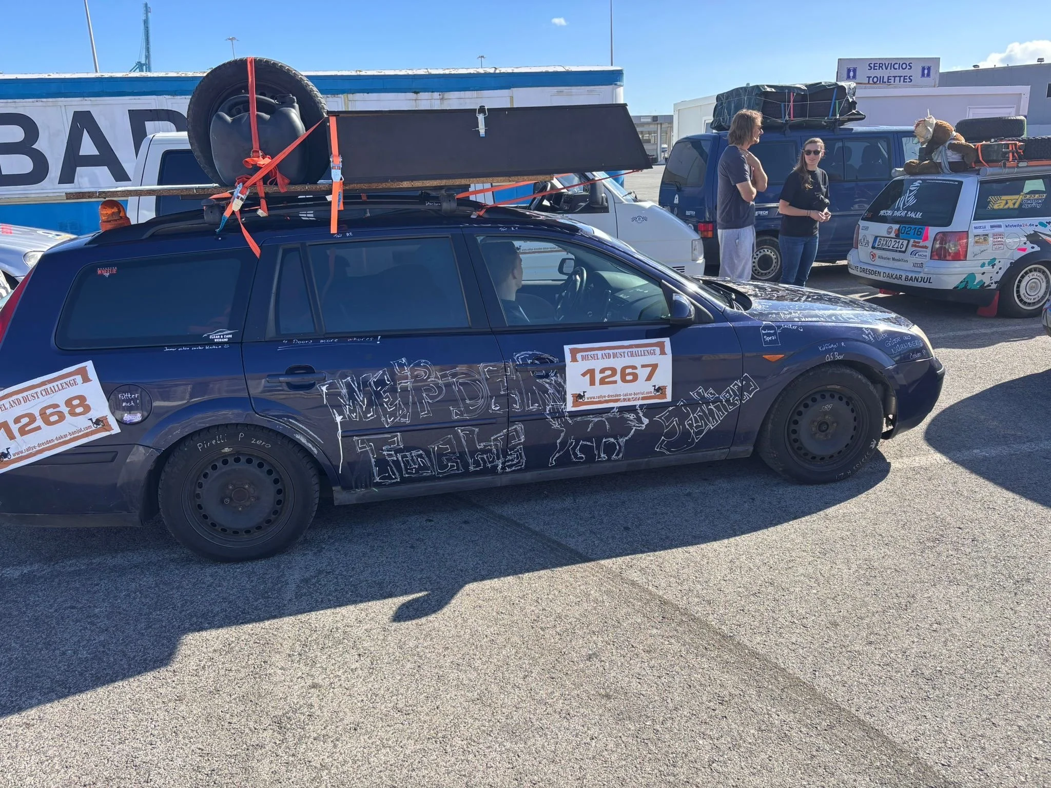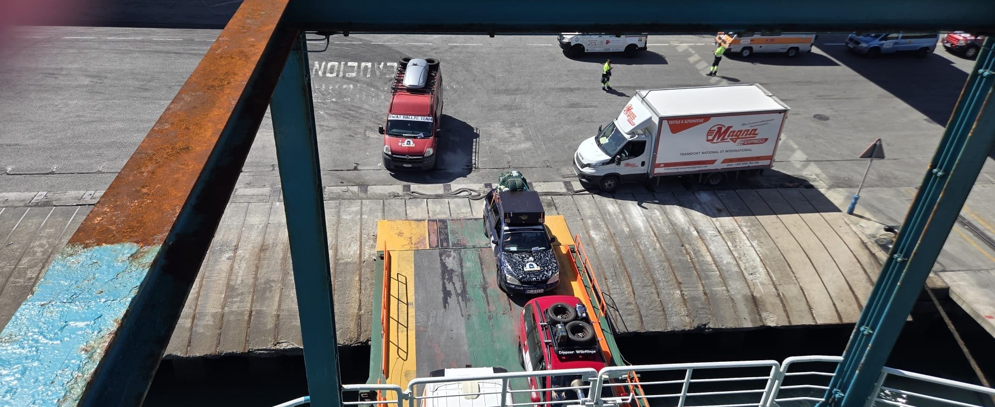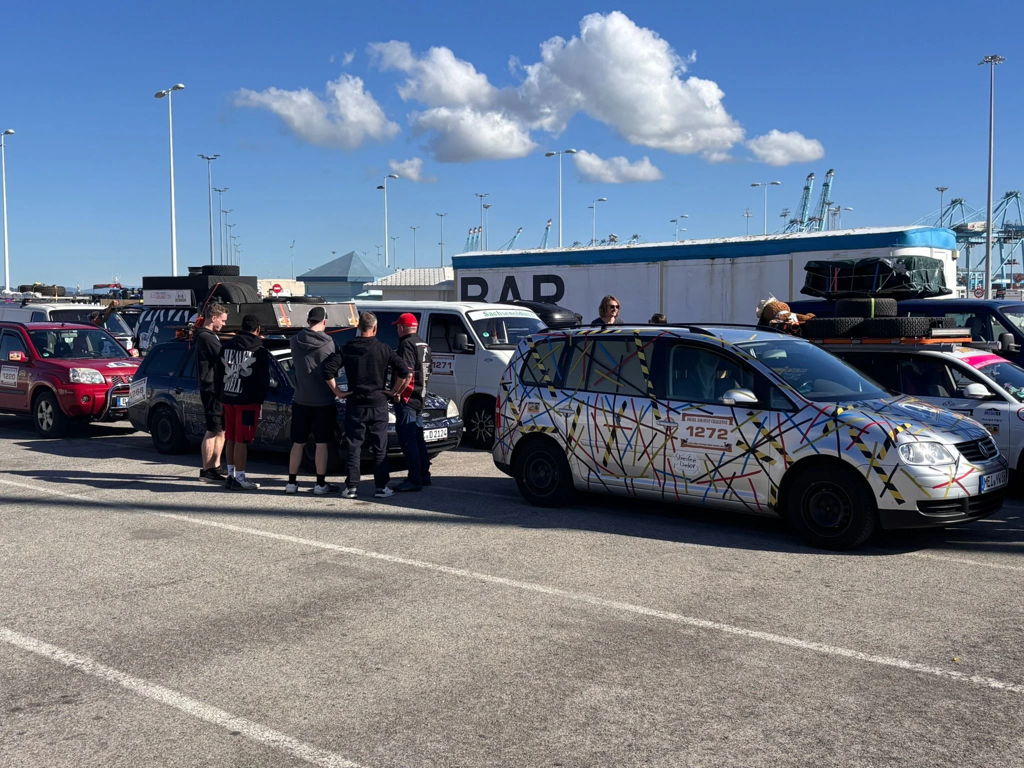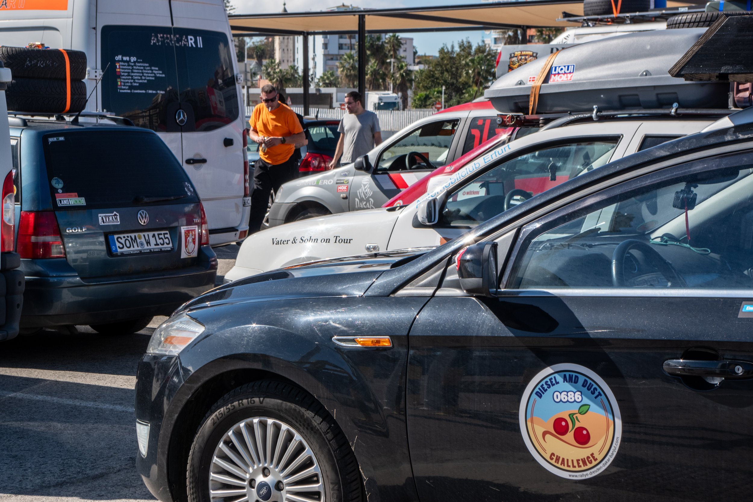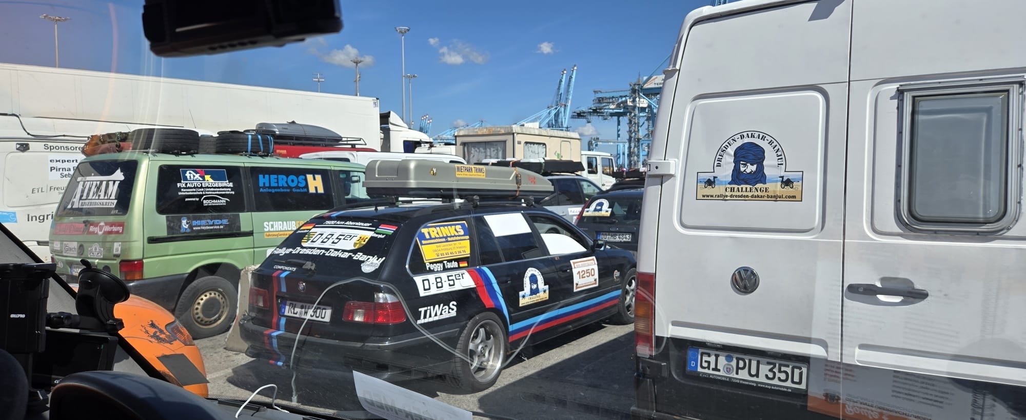 Die Zeit zwischen der Ankunft im Hafen und dem Ablegen der Fähre wurde für ein Briefing und zum näheren Kennenlernen genutzt. Schließlich trafen hier zum ersten Mal fast alle Teams aufeinander. Fünf Teams waren bereits vor ein paar Tagen nach Marokko eingereist und das Team „Ostblock-Customs“ musste noch auf Ersatzteile warten. Sie wollten aber die letzte Fähre heute schaffen.