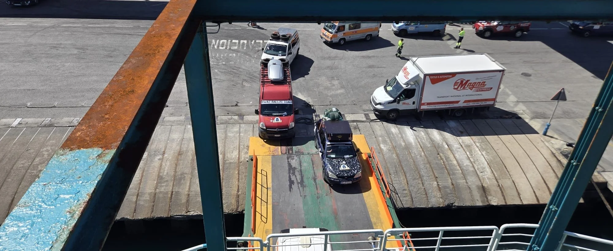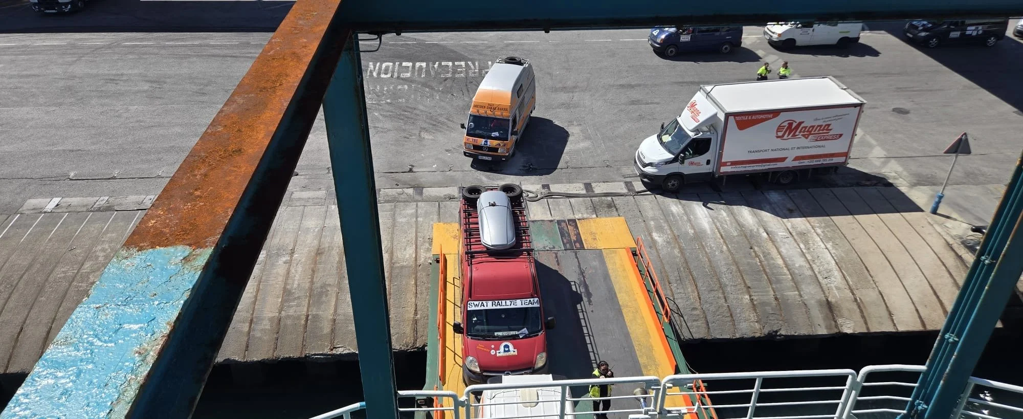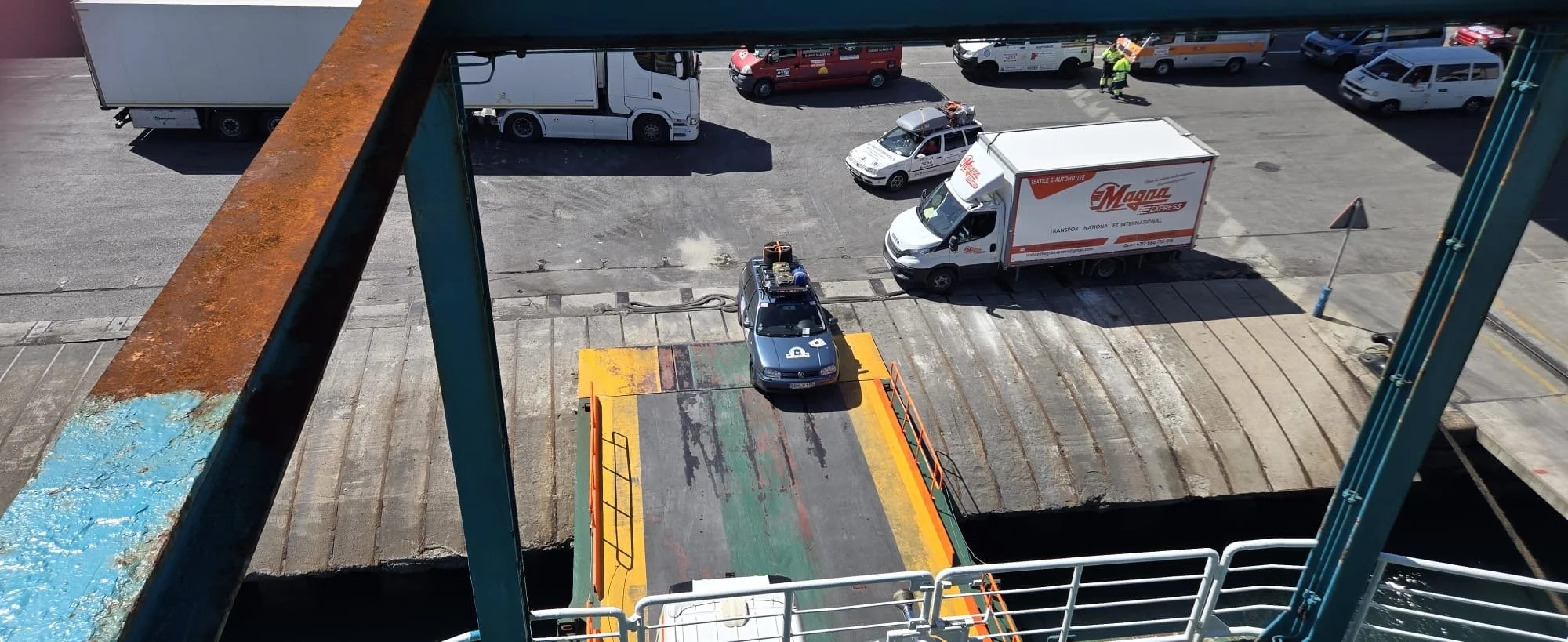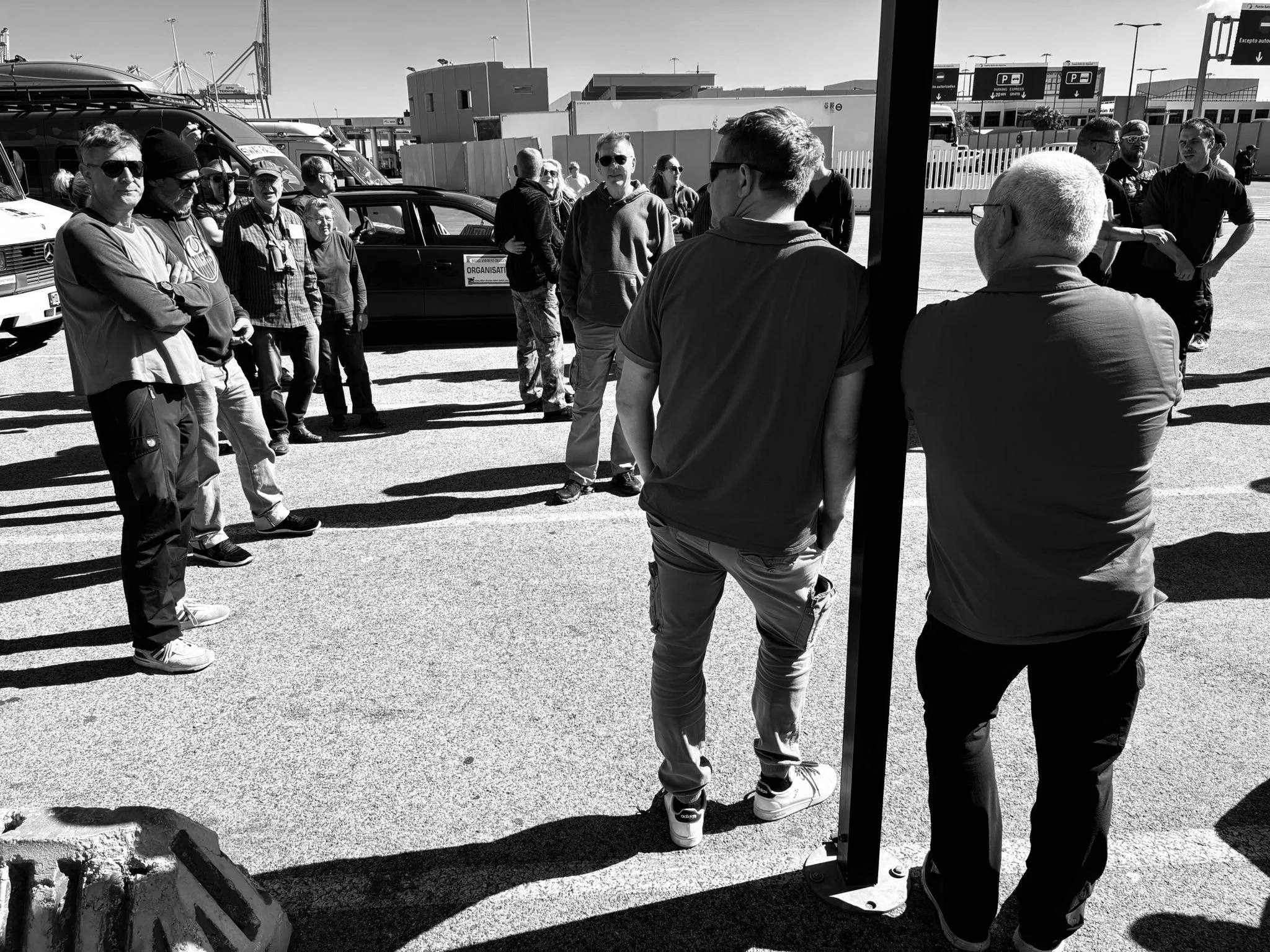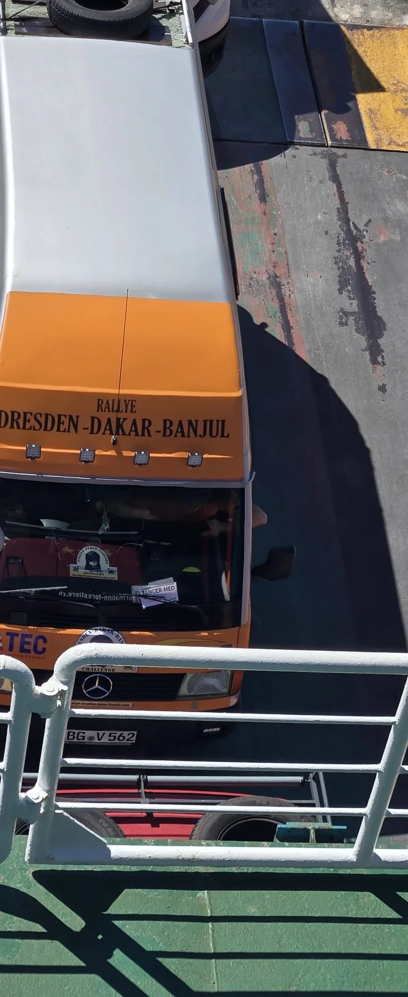Die Zeit zwischen der Ankunft im Hafen und dem Ablegen der Fähre wurde für ein Briefing und zum näheren Kennenlernen genutzt. Schließlich trafen hier zum ersten Mal fast alle Teams aufeinander. Fünf Teams waren bereits vor ein paar Tagen nach Marokko eingereist und das Team „Ostblock-Customs“ musste noch auf Ersatzteile warten. Sie wollten aber die letzte Fähre heute schaffen.