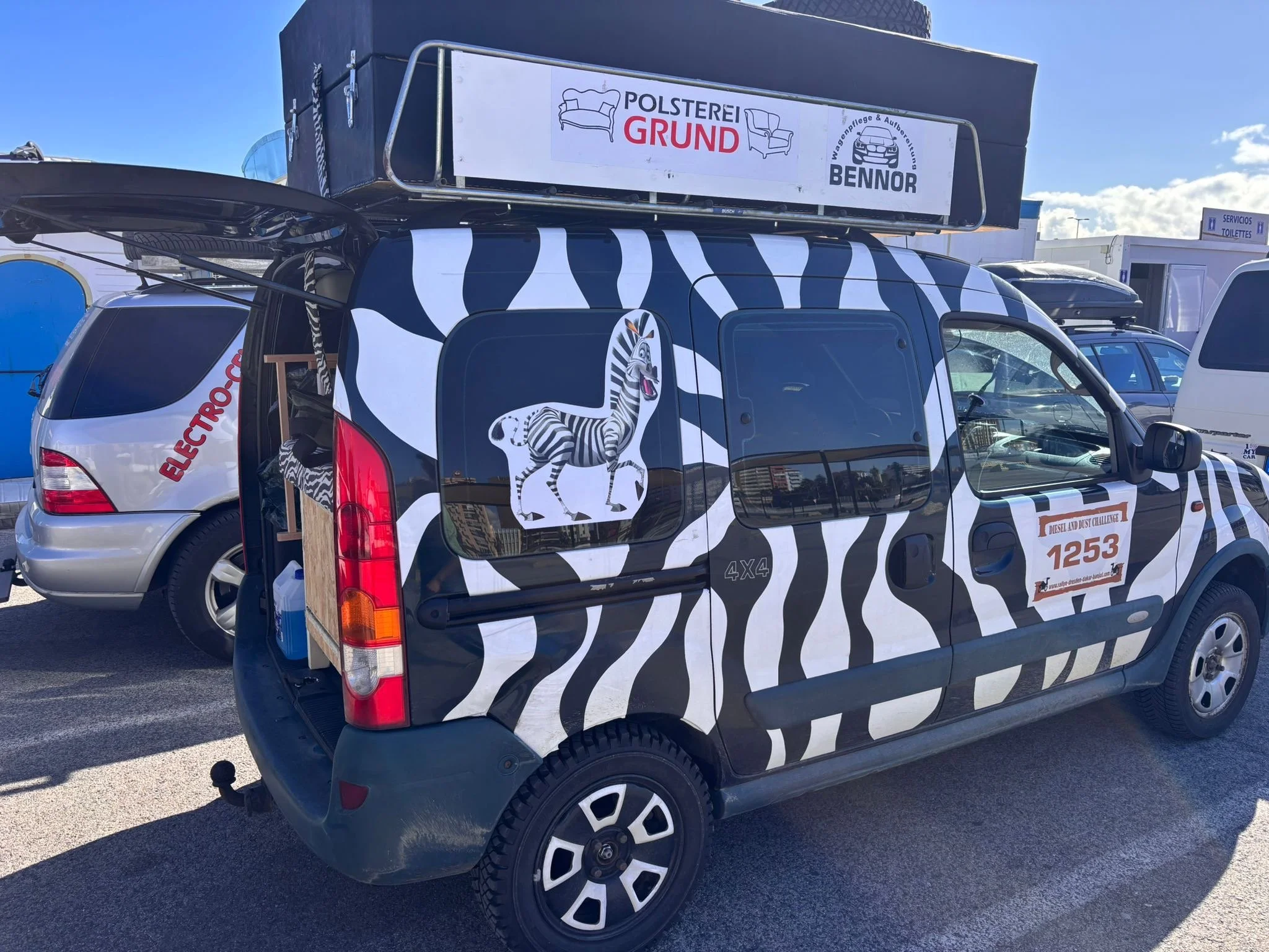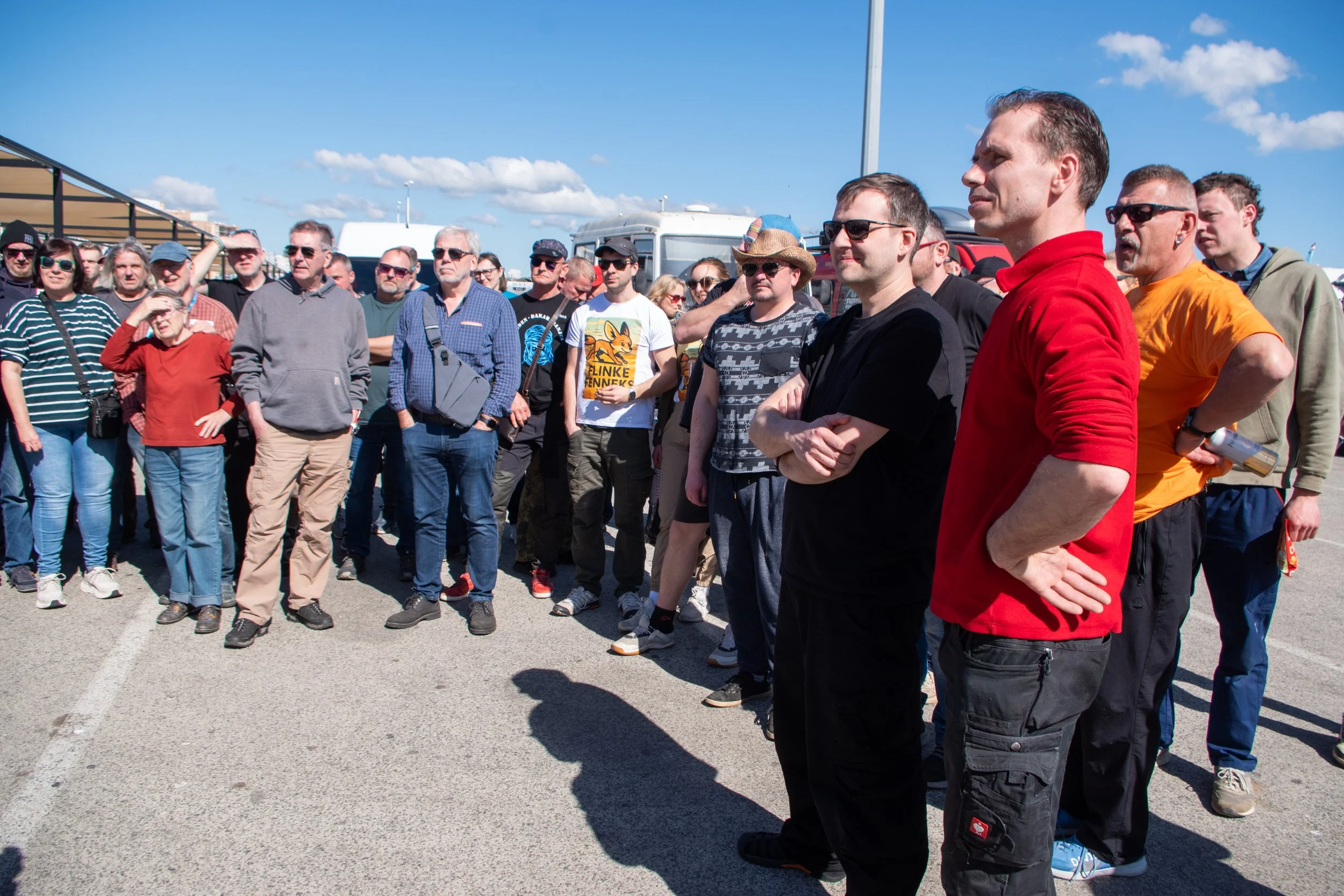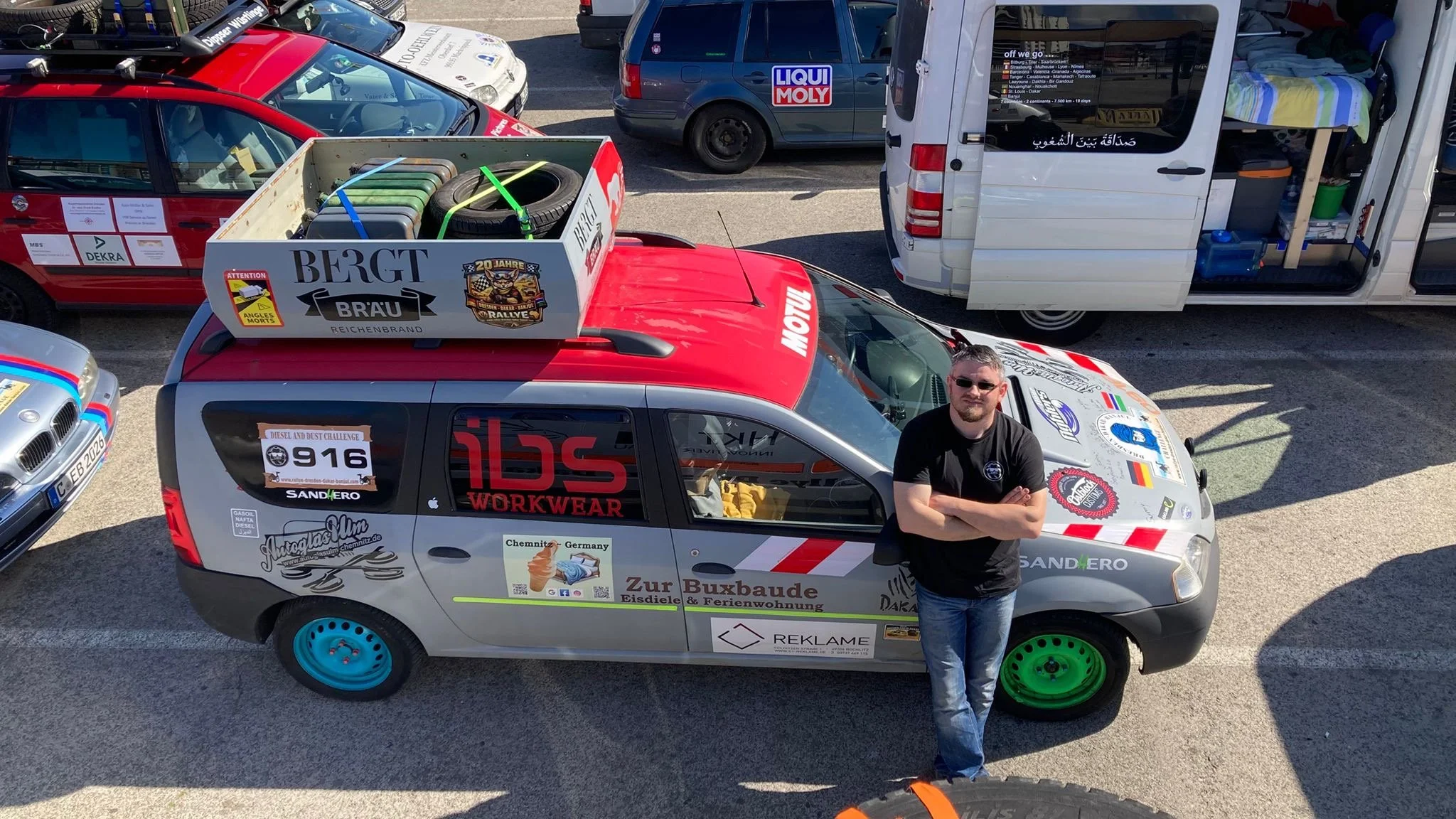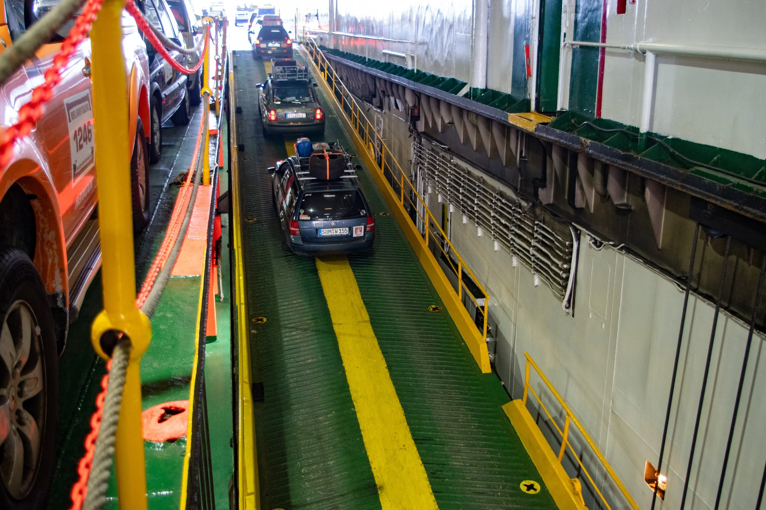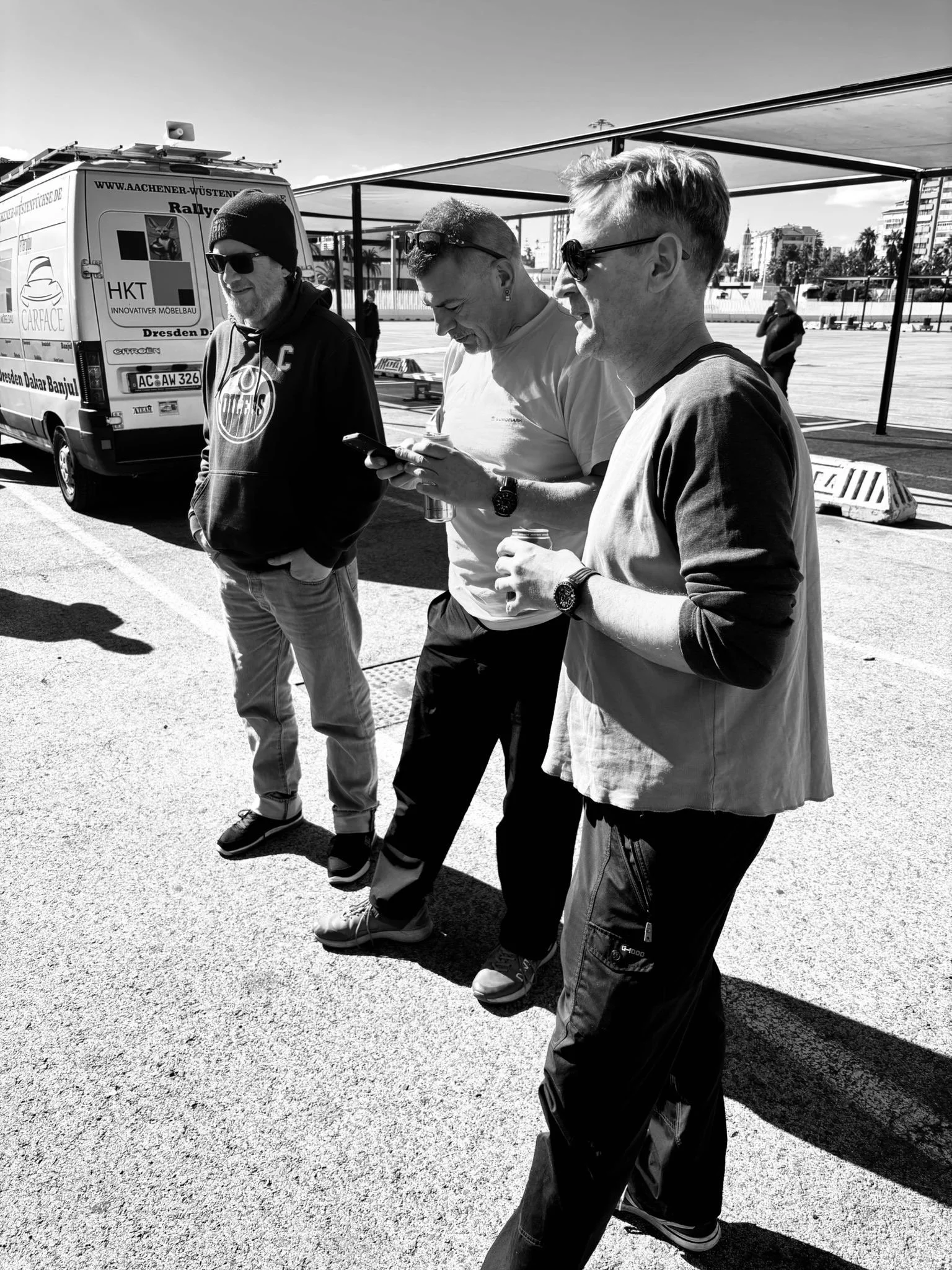 Die Zeit zwischen der Ankunft im Hafen und dem Ablegen der Fähre wurde für ein Briefing und zum näheren Kennenlernen genutzt. Schließlich trafen hier zum ersten Mal fast alle Teams aufeinander. Fünf Teams waren bereits vor ein paar Tagen nach Marokko eingereist und das Team „Ostblock-Customs“ musste noch auf Ersatzteile warten. Sie wollten aber die letzte Fähre heute schaffen.