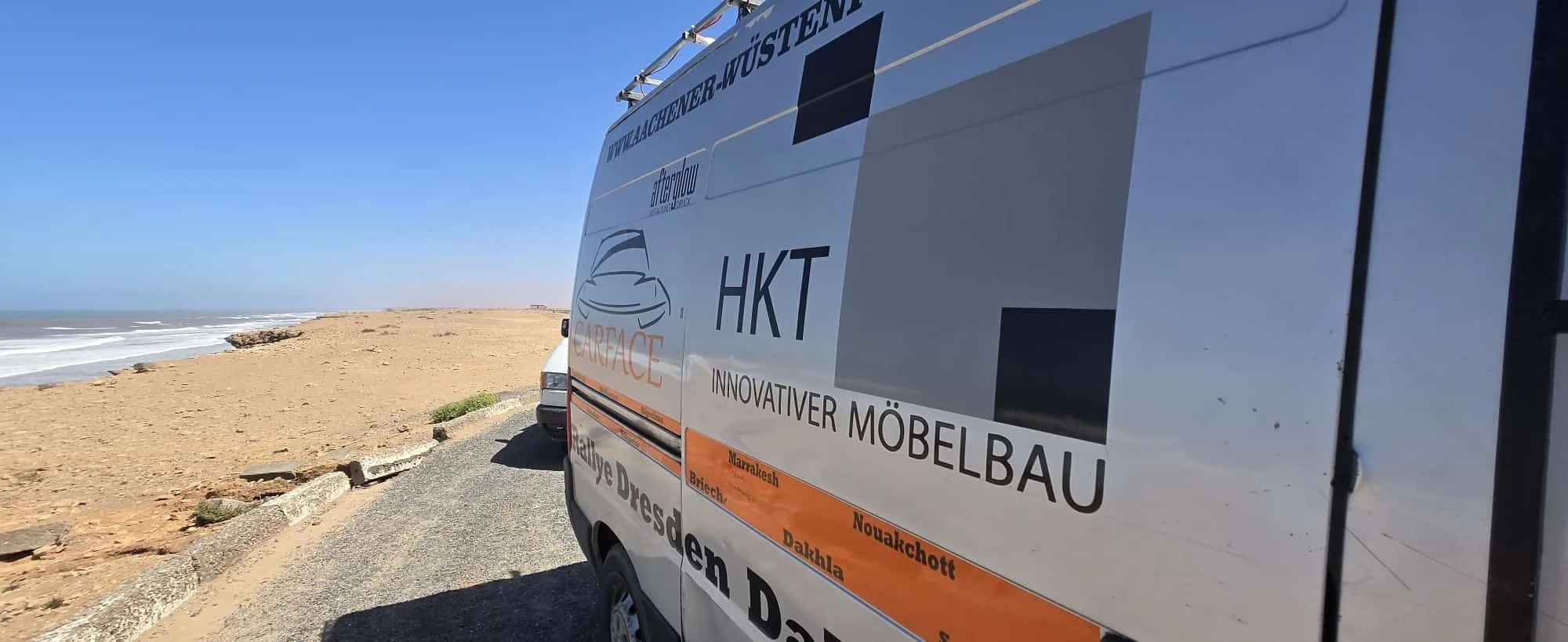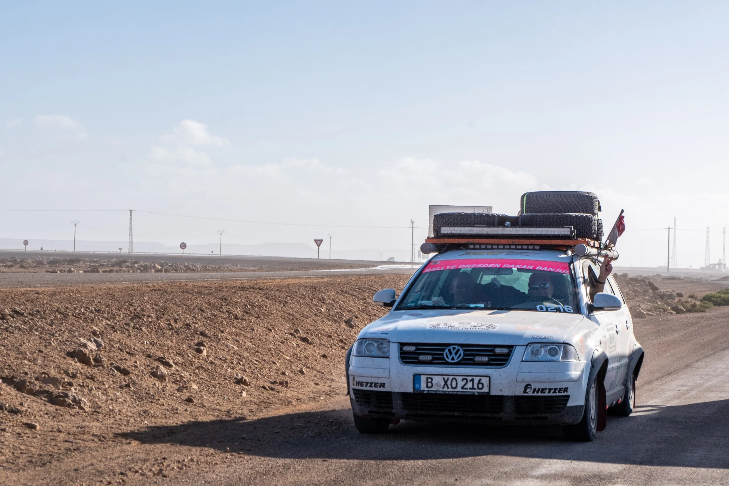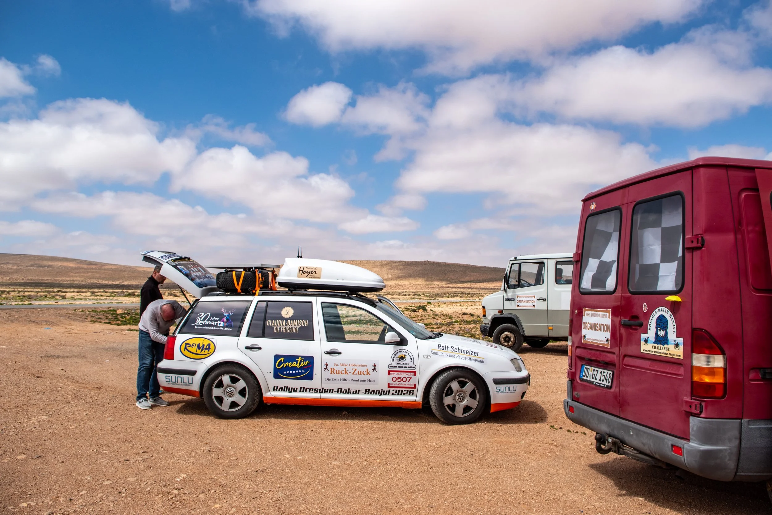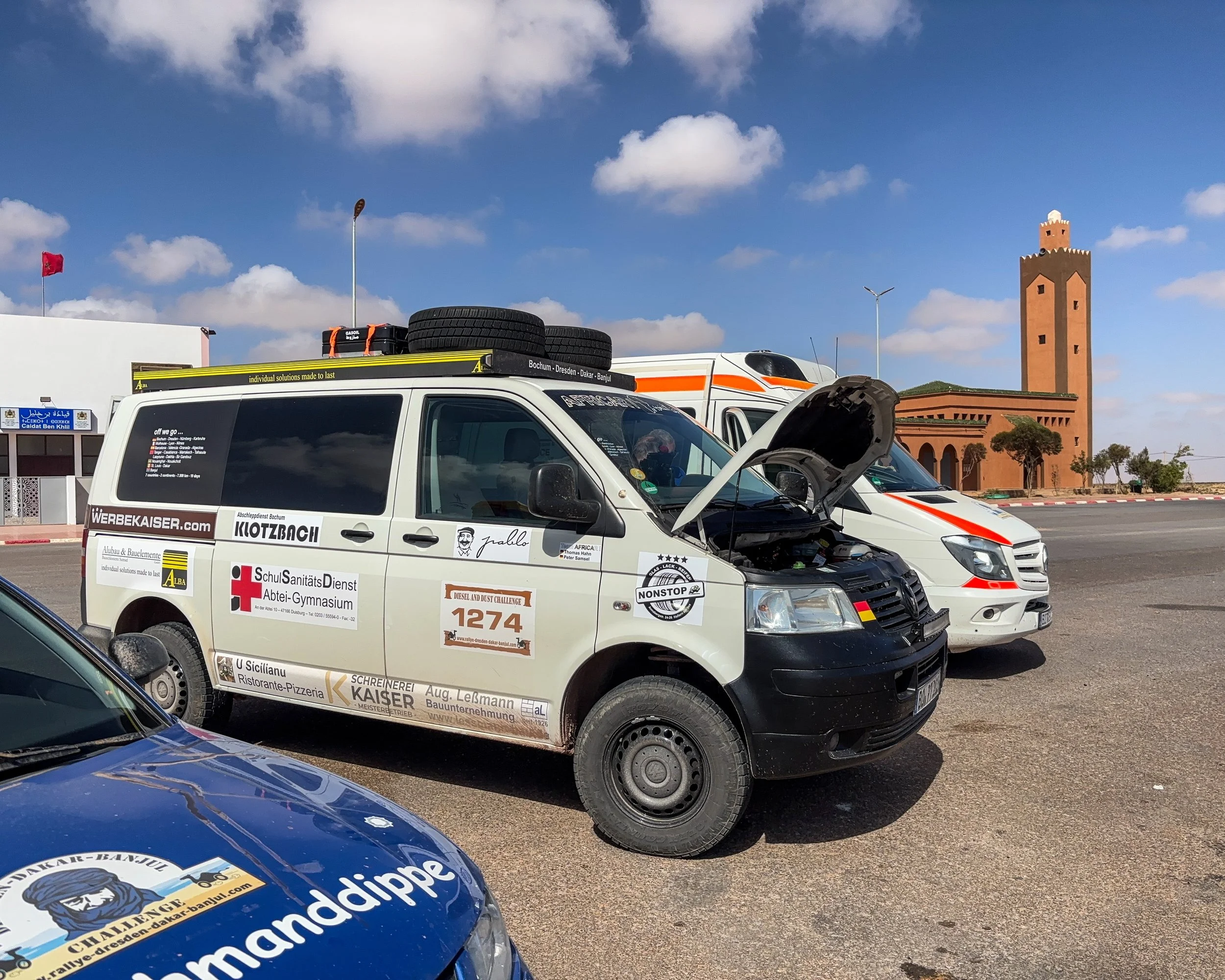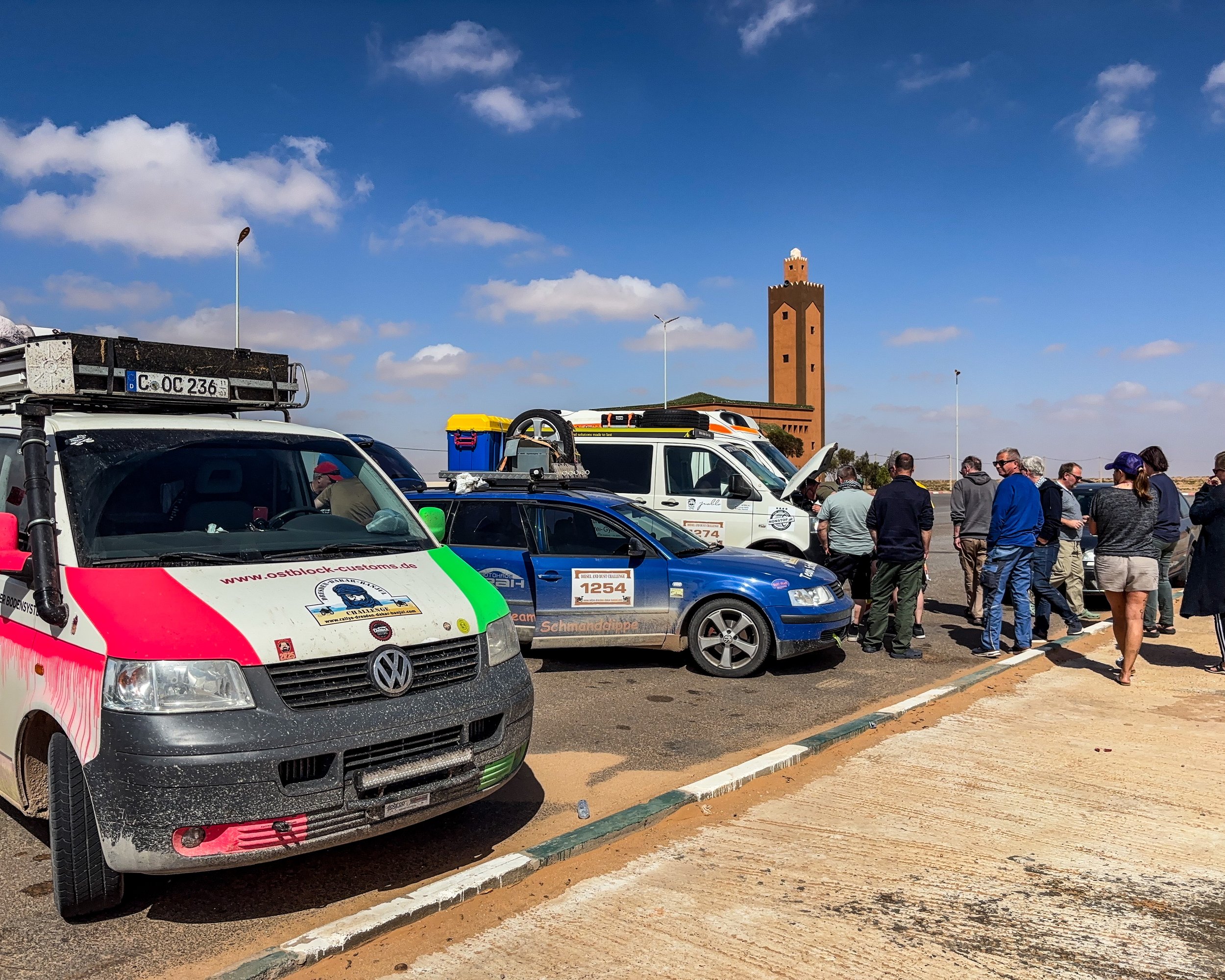 Leider gibt es auch noch einen weiteren Havaristen. Der VW T5 von Team „Africa 1“ fährt nicht mehr mit voller Leistung. Er hat einen defekten Ladeluftkühler und muss morgen in Laayoune eine Werkstatt aufsuchen.