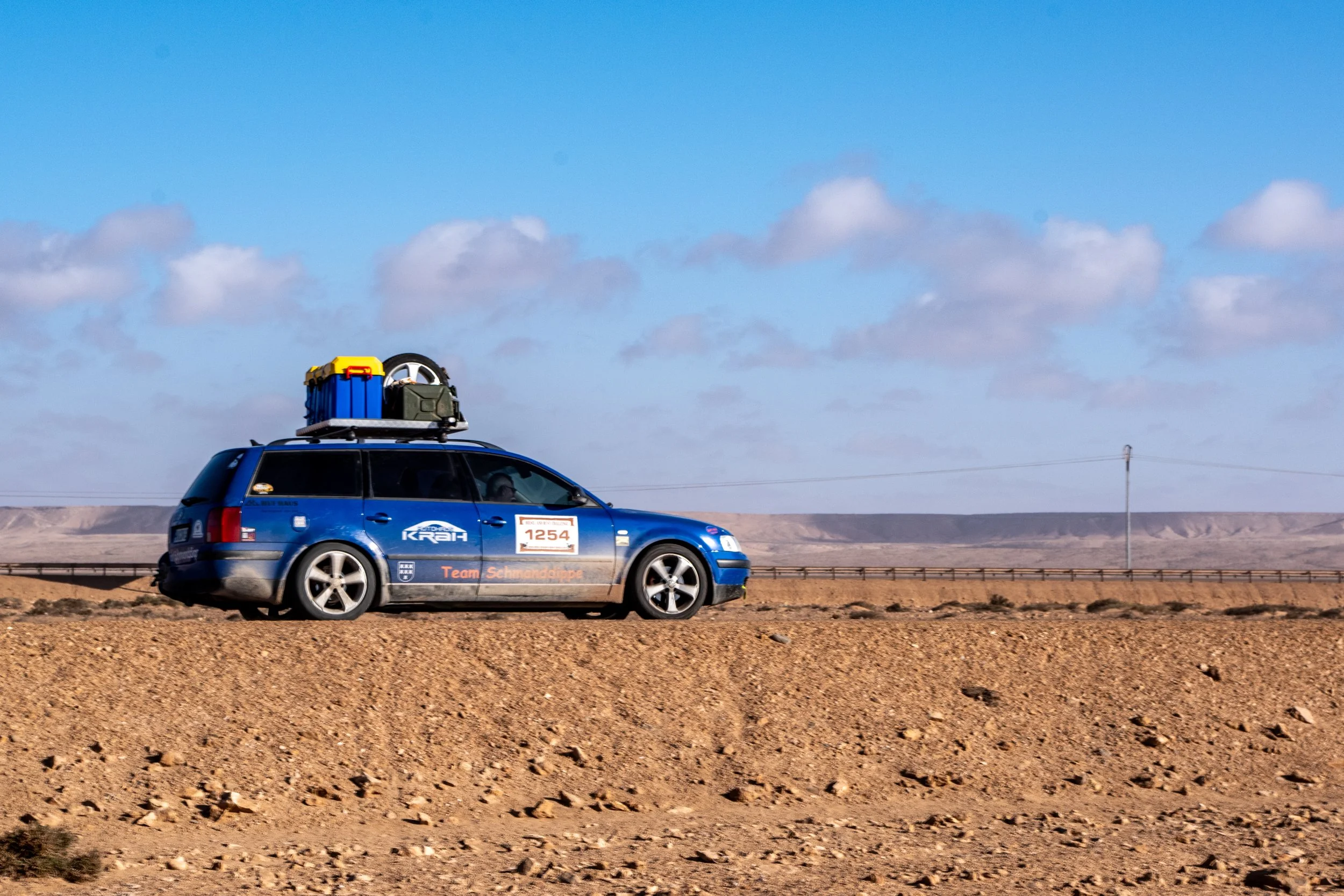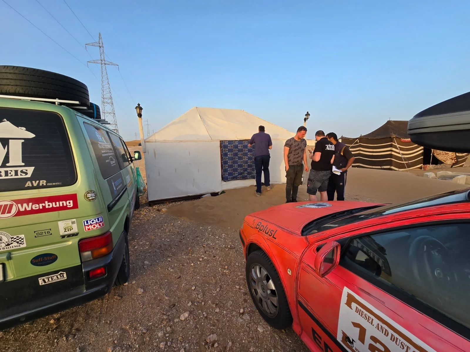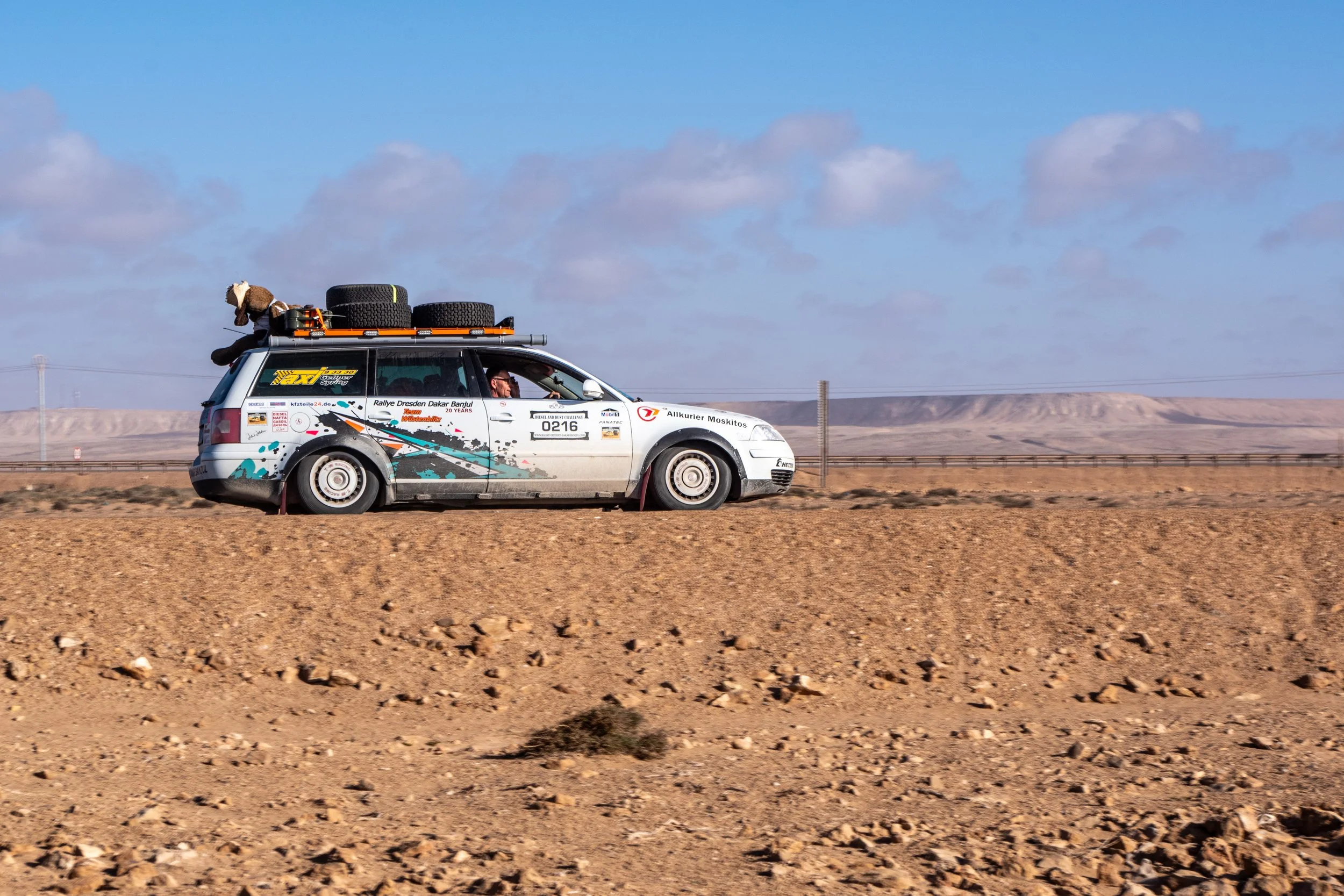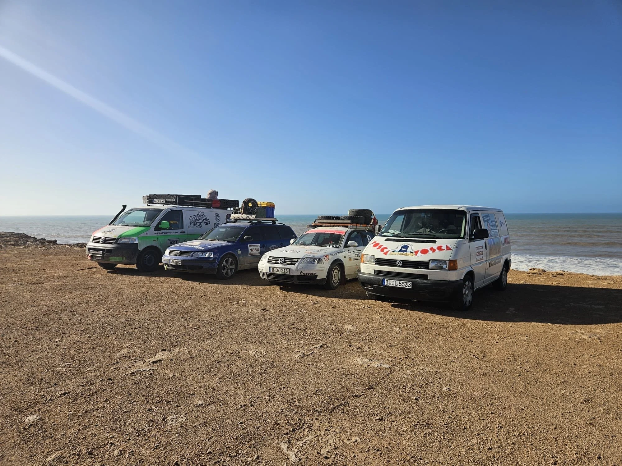 Leider gibt es auch noch einen weiteren Havaristen. Der VW T5 von Team „Africa 1“ fährt nicht mehr mit voller Leistung. Er hat einen defekten Ladeluftkühler und muss morgen in Laayoune eine Werkstatt aufsuchen.